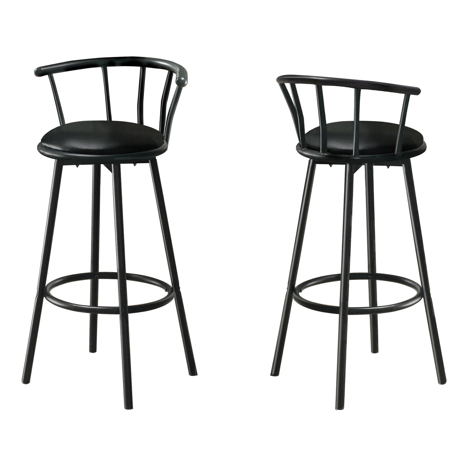 The real deal when it comes to bar stools, this set of 2 is made for your kitchen against the counter or along the wall. With a curved back, the stools are equipped with a 360-degree swivel base, making your entertainment area a fun place to be for you and your guests. Upholstered in a black faux leather material with thick cushions for comfort, the black metal bases are sturdy and offer a bottom footrest bar. Bring this contemporary style to your living space - These two bar chairs are ready!
