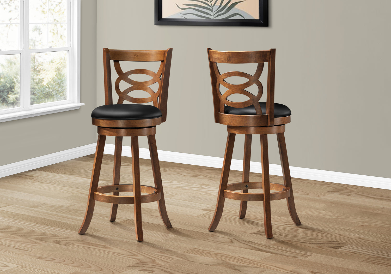 Style or comfort? Why pick when this set of 2 dark oak finish wood barstools blends both so seamlessly. With plush black leather-look 360 degrees swivel seats, interlocking circle design and perfectly positioned circular footrest, these bar height barstools will add a touch of elegance to any game room or dining area.