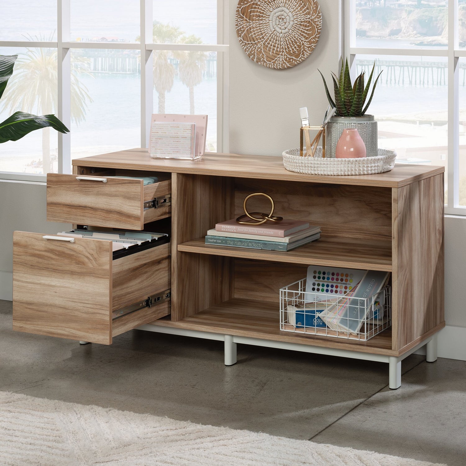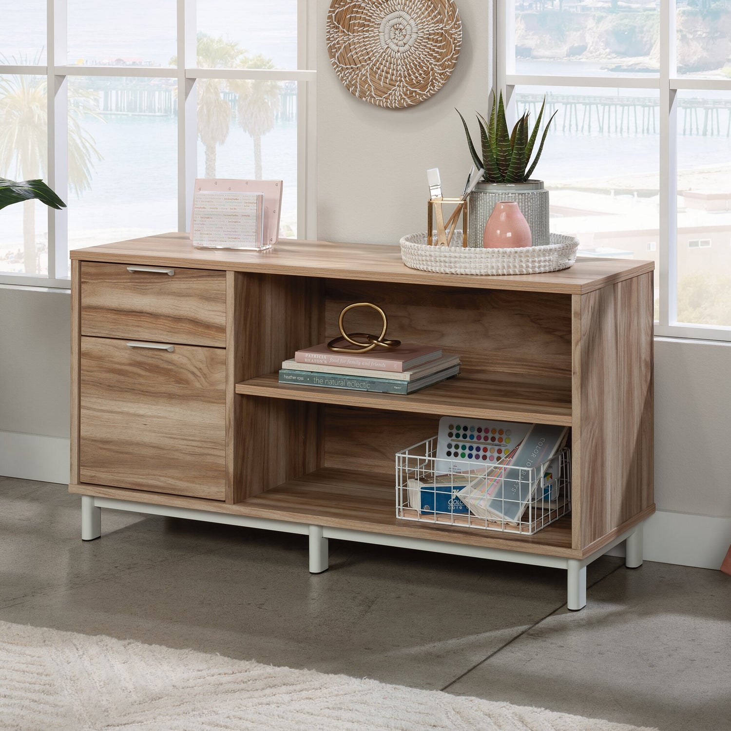 Boring commercial storage is a thing of the past. All your important files and office essentials are easy to find and neatly stored with this Bergen Circle credenza. This modern piece features two drawers, with one able to accommodate letter-size hanging files—keeping your important documents at easy reach. The open storage area with adjustable shelf provides you with the perfect space for easy access to binders or to display home decor. With a stunning multi-tone finish and powder-coated white metal legs, this cabinet will bring sophistication and enhanced design to your office.