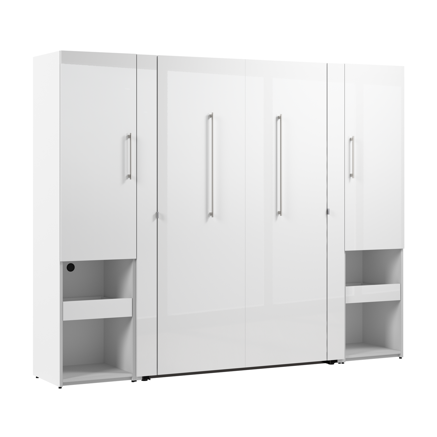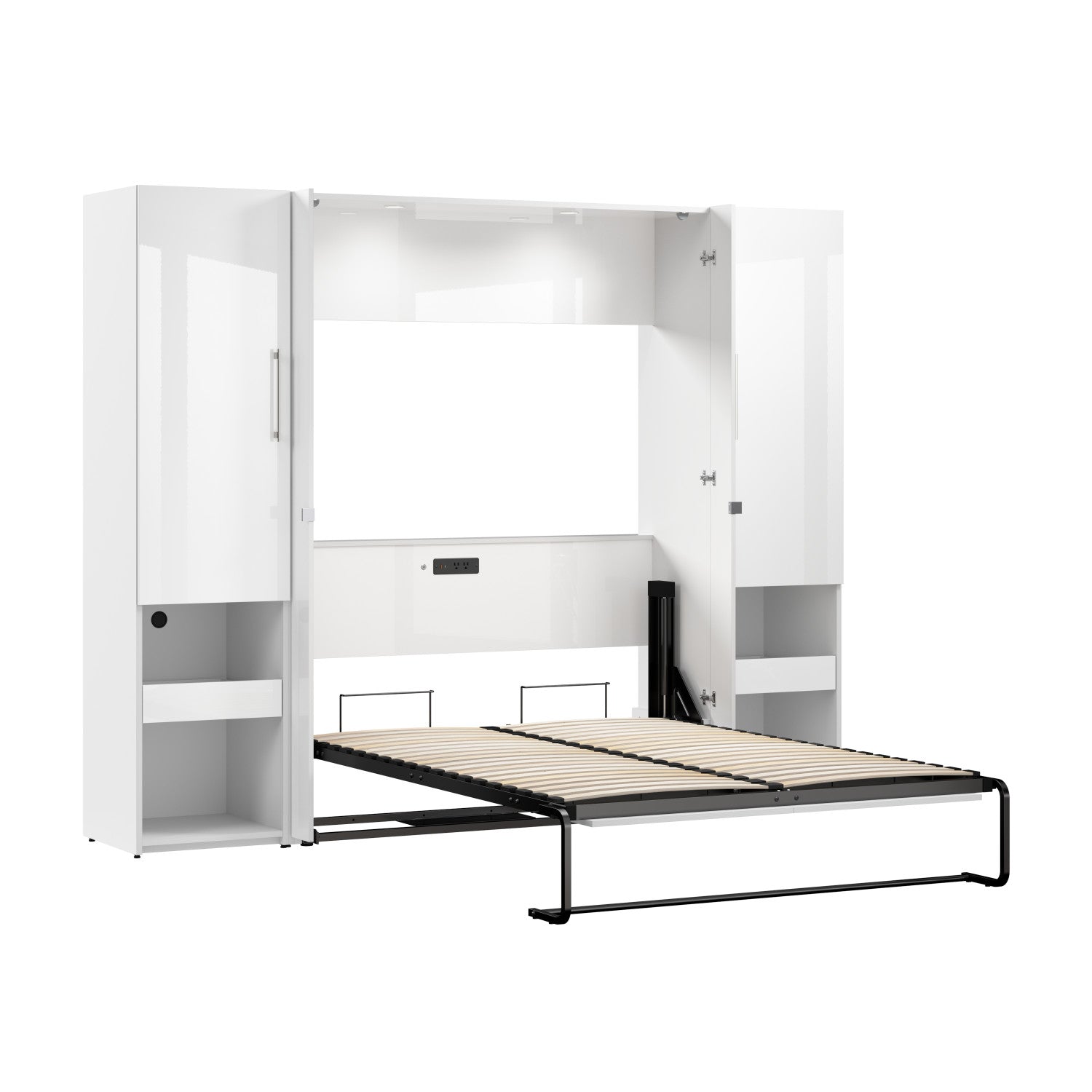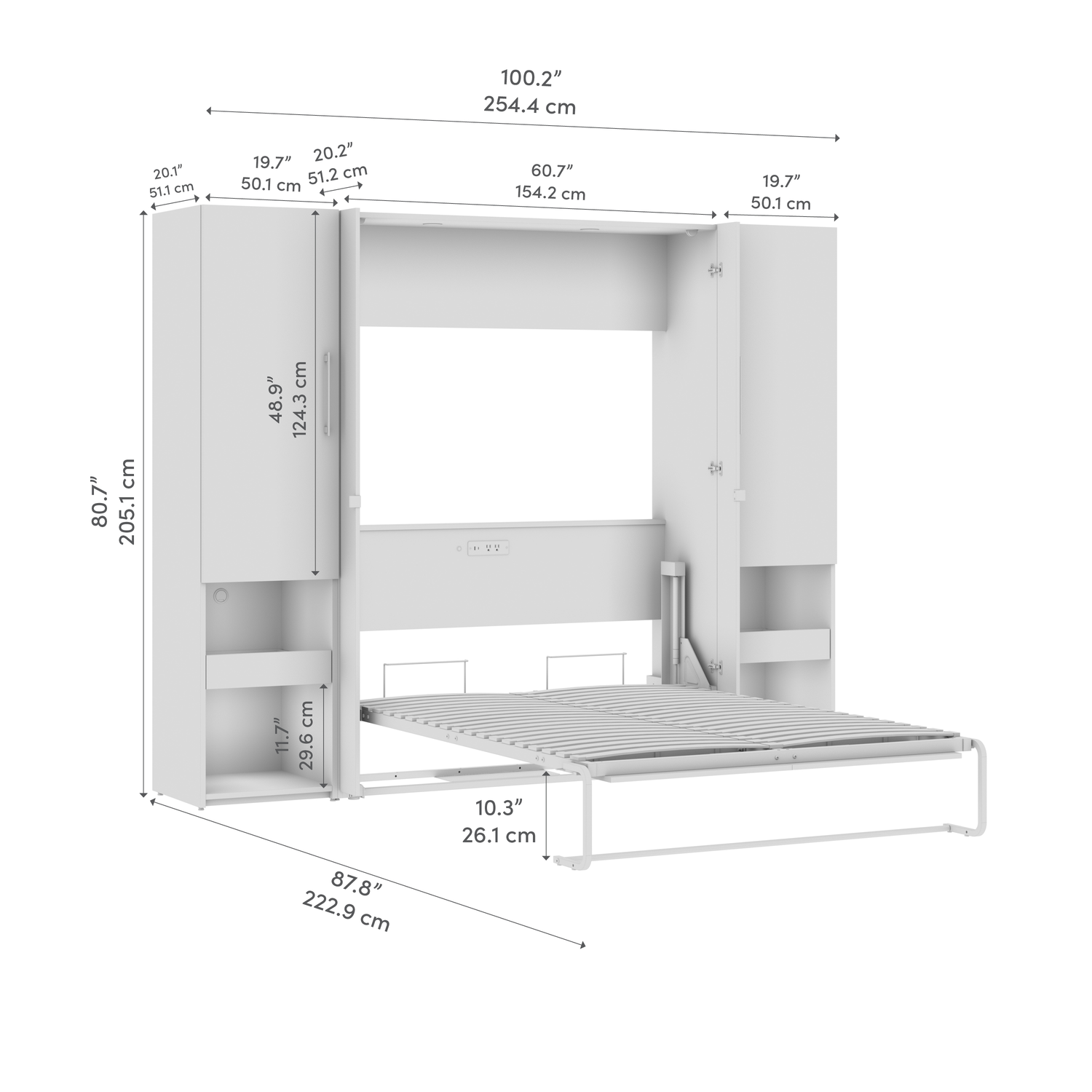 The Bestar Avalon Full Murphy Bed and Storage Cabinets with Pull-Out Shelf (101W) creates a multifunctional room and elevates your space. With its scratch-resistant high-gloss finish with sleek pulls and built-in lighting, this wall bed set has a chic, contemporary look. The bed folds up and down quickly and smoothly so you can sleep comfortably at night and enjoy more space during the day. Storage cabinets with a mix of open and closed storage include a pull-out shelf that makes a great bedside table. USB-A, USB-C and AC power ports on bed's headboard help charge your devices. The mattress support uses flexible slats that follow the curves of the body. Choose your own mattress since the bed accommodates most standard Full mattresses. Open bed extends 87.8 inches from the wall. Allow a clearance of 30-36 inches around the bed. The dual-mount wall bed mechanism attaches to the floor and wall for maximum stability and durability. To avoid risk of injury, the Murphy bed must be installed to wall and floor structure by a professional or qualified person. Two people are required for assembly. Installation requires attachment to wood studs or masonry, removal of the baseboard, and drilling into the floor. All necessary hardware is included. Minimum ceiling height of 85.7 inches. Do not use this product for children or pets under 50 pounds (22.7 kg). Murphy bed set is backed by the Bestar 10 Year Manufacturer’s Warranty. North American made with globally sourced materials.