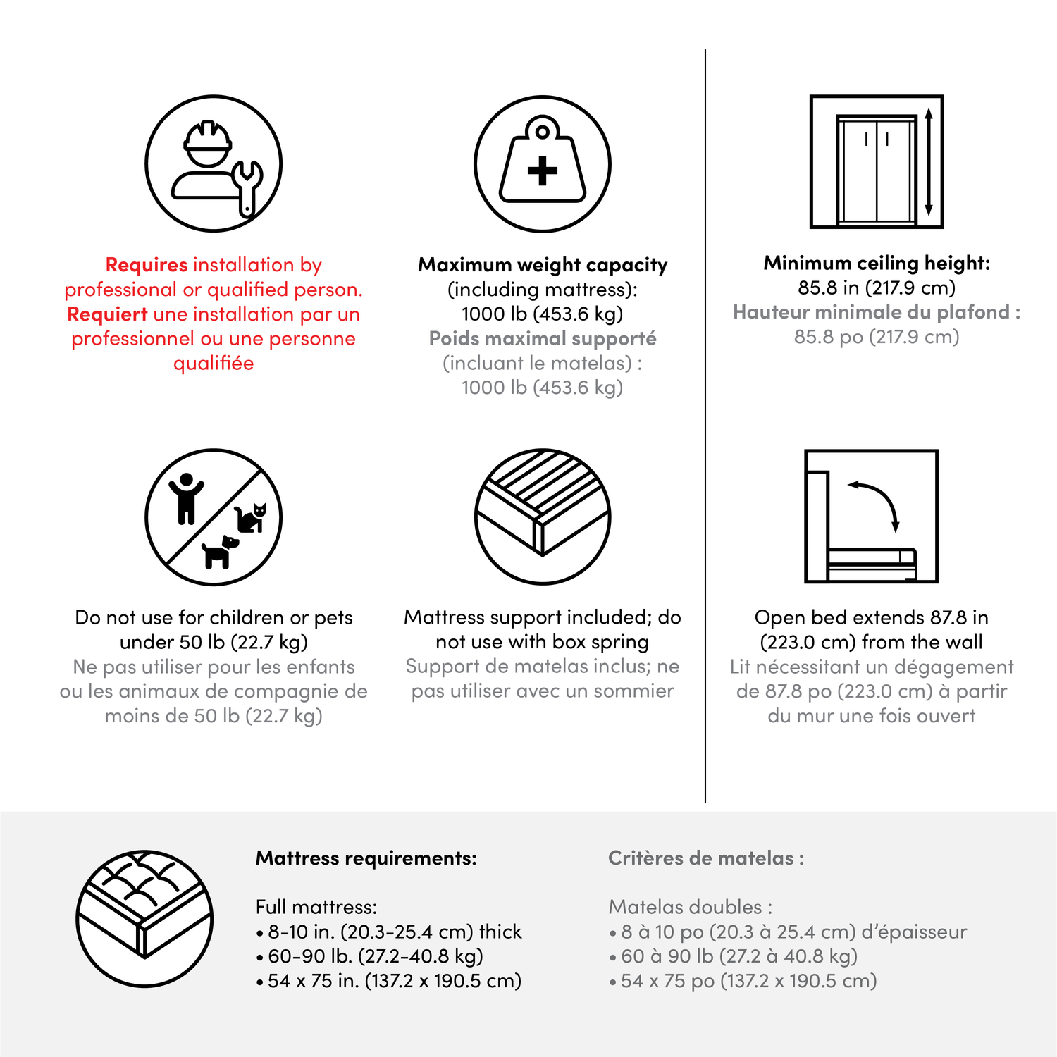 | Safety Details | Dual-mount wall bed mechanism attaches to floor and wall for ease of assembly and maximum stability and durability. |