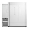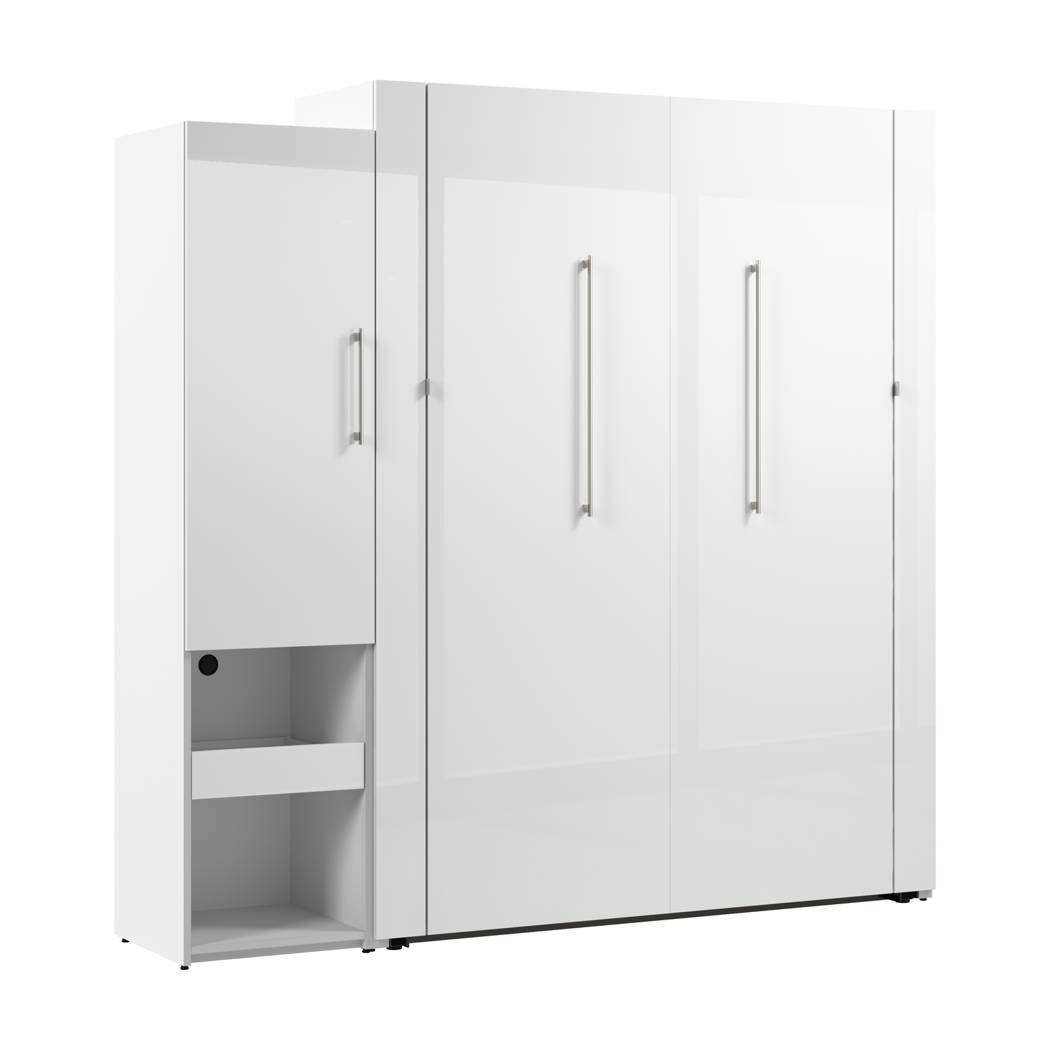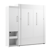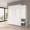 The Bestar Avalon Queen Murphy Bed and Storage Cabinet with Pull-Out Shelf (87W) creates a multifunctional room and elevates your space. With its scratch-resistant high-gloss finish with sleek pulls and built-in lighting, this wall bed set has a chic, contemporary look. The bed folds up and down quickly and smoothly so you can sleep comfortably at night and enjoy more space during the day. Storage cabinet with a mix of open and closed storage includes a pull-out shelf that makes a great bedside table. USB-A, USB-C and AC power ports on bed's headboard help charge your devices. The mattress support uses flexible slats that follow the curves of the body. Choose your own mattress since the bed accommodates most standard Queen mattresses. Open bed extends 92.7 inches from the wall. Allow a clearance of 30-36 inches around the bed. The dual-mount wall bed mechanism attaches to the floor and wall for maximum stability and durability. To avoid risk of injury, the Murphy bed must be installed to wall and floor structure by a professional or qualified person. Two people are required for assembly. Installation requires attachment to wood studs or masonry, removal of the baseboard, and drilling into the floor. All necessary hardware is included. Minimum ceiling height of 87.5 inches. Do not use this product for children or pets under 50 pounds (22.7 kg). Murphy bed set is backed by the Bestar 10 Year Manufacturer’s Warranty. North American made with globally sourced materials.