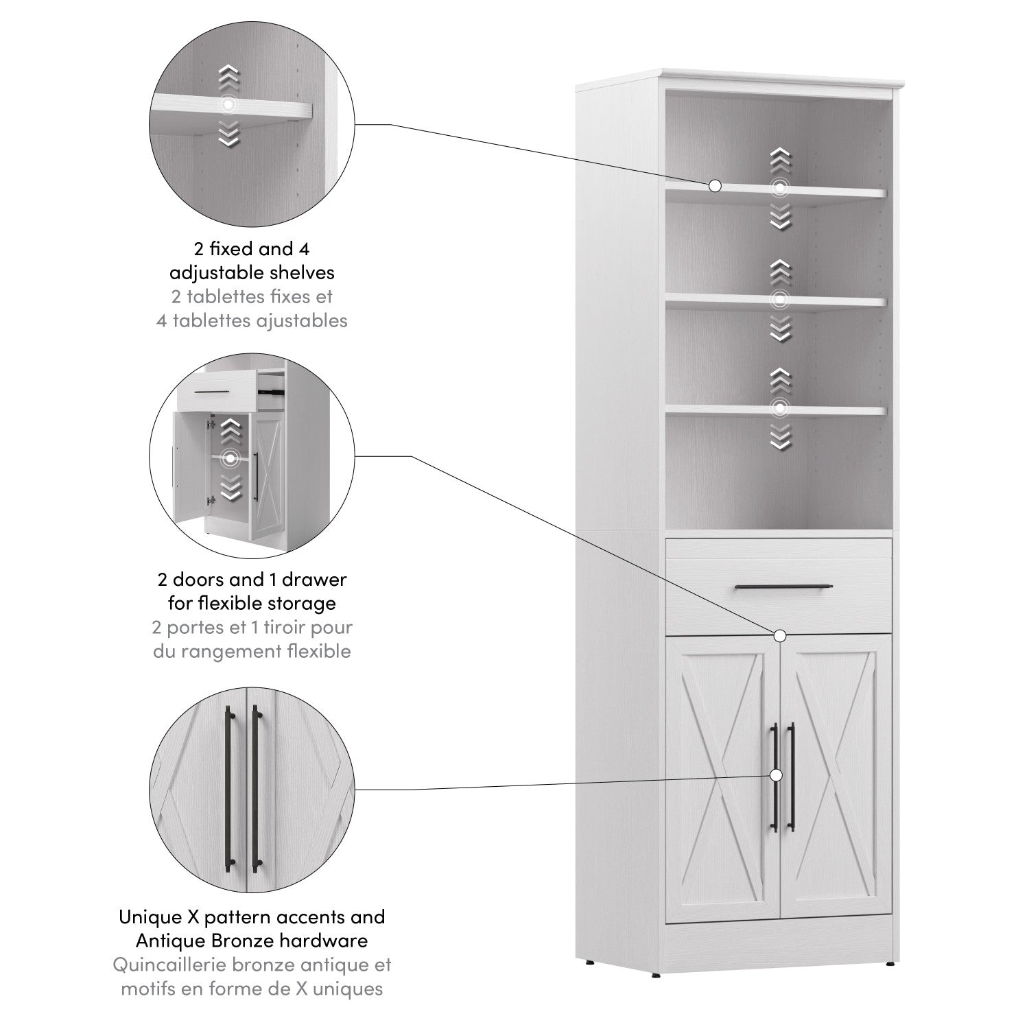 The Bestar Key West 25W Closet Organizer with Drawer and Doors is a great storage solution for any space. This shelving unit serves as the perfect tall narrow bookshelf, linen cabinet, or simply as a great way to round out your bedroom set. Add the storage cabinet to your Key West Collection Murphy Bed (sold separately) to finish off your room with all the storage you need, or set up the freestanding unit wherever you need extra organization. Thanks to its sleek look, this tall bookcase is sure to match your home decor style. The closet organizer includes one fixed and four adjustable shelves to allow for customizable decoration or storage of any room, from your bathroom to your laundry room or home office. Move the shelves as you see fit to accommodate objects of various sizes. Closet doors with drawer cover the lower shelves of your closet organizer and create a mix of open and concealed storage, while unique X pattern accents paired with Antique Bronze hardware exude a relaxed and airy style that works well with coastal and farmhouse decor. Drawer glides on smooth ball bearing slides, while cabinet doors feature smooth self-closing, Euro-style hinges for an effortless open and close. Top surface can be used to store items you don't reach for often, blankets, and to display plants or decorations. Quality engineered wood compliant with TSCA Title VI. Assembly required (2 people recommended).This shelf organizer is backed by the Bestar 10 Year Manufacturer's Warranty.