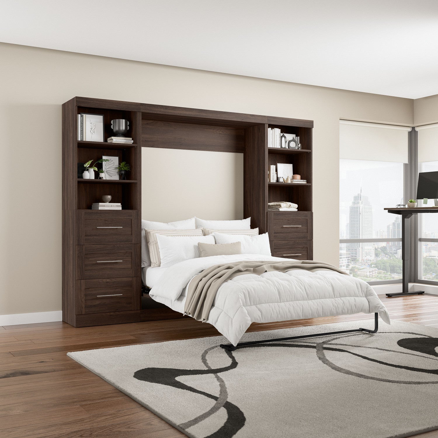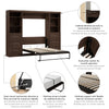 The Bestar Pur Full Murphy Bed and 2 Shelving Units with Drawers (109W) is the ideal space saver for a multipurpose room. The mattress support uses flexible slats that follow the curves of the body and absorb pressure for maximum comfort. The Full Murphy bed folds up and down smoothly thanks to the dual piston system. The wall bed can be used every night for a good night’s sleep. The bed accommodates most standard Full mattresses (8-10 inches thick, 60-90 lb, 54 x 75 inches) and supports up to 1000 lb (including mattress). The open bed extends 84.9 inches from the wall. The cabinet must be anchored to a wall with a minimum ceiling height of 86.4 inches. Allow a clearance of 30-36 inches around the open bed. Shelving units come with 2 fixed and 3 adjustable shelves, plus 3 drawers to hold your belongings. The dual-mount wall bed mechanism attaches to the floor and wall for maximum stability and durability. To avoid risk of injury, the Murphy bed must be installed to wall and floor structure by a professional or qualified person. Two people are required for assembly. Installation requires attachment to wood studs or masonry, removal of the baseboard, and drilling into the floor (if disassembly is required, holes may be covered with baseboards 0.5 inches or thicker). All necessary hardware is included. Do not use this product for children or pets under 50 pounds (22.7 kg). Backed by the Bestar 10 Year Manufacturer’s Warranty. North American made with globally sourced materials.
