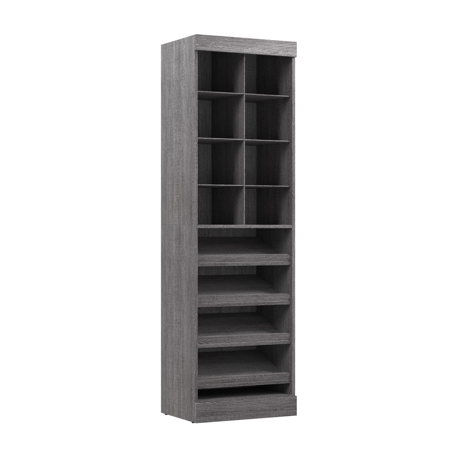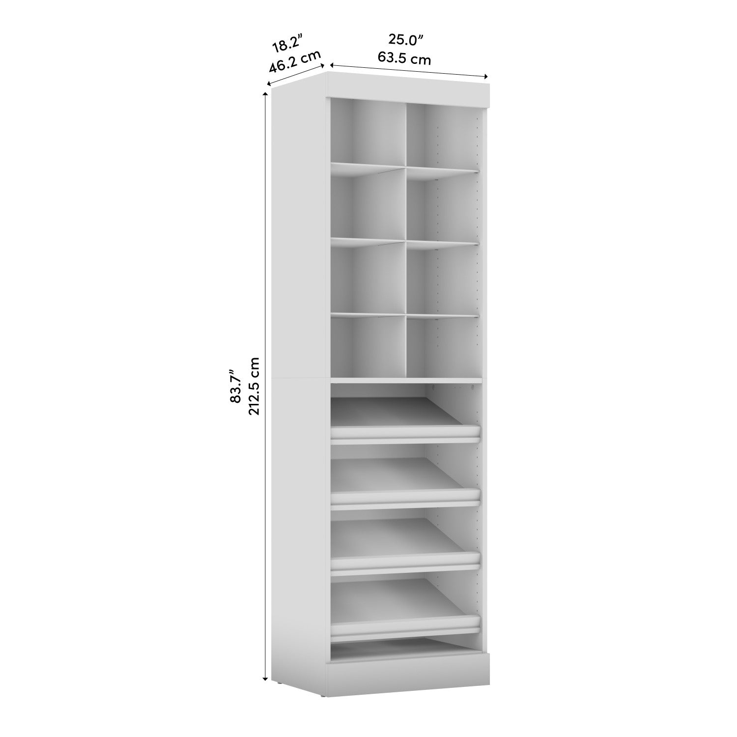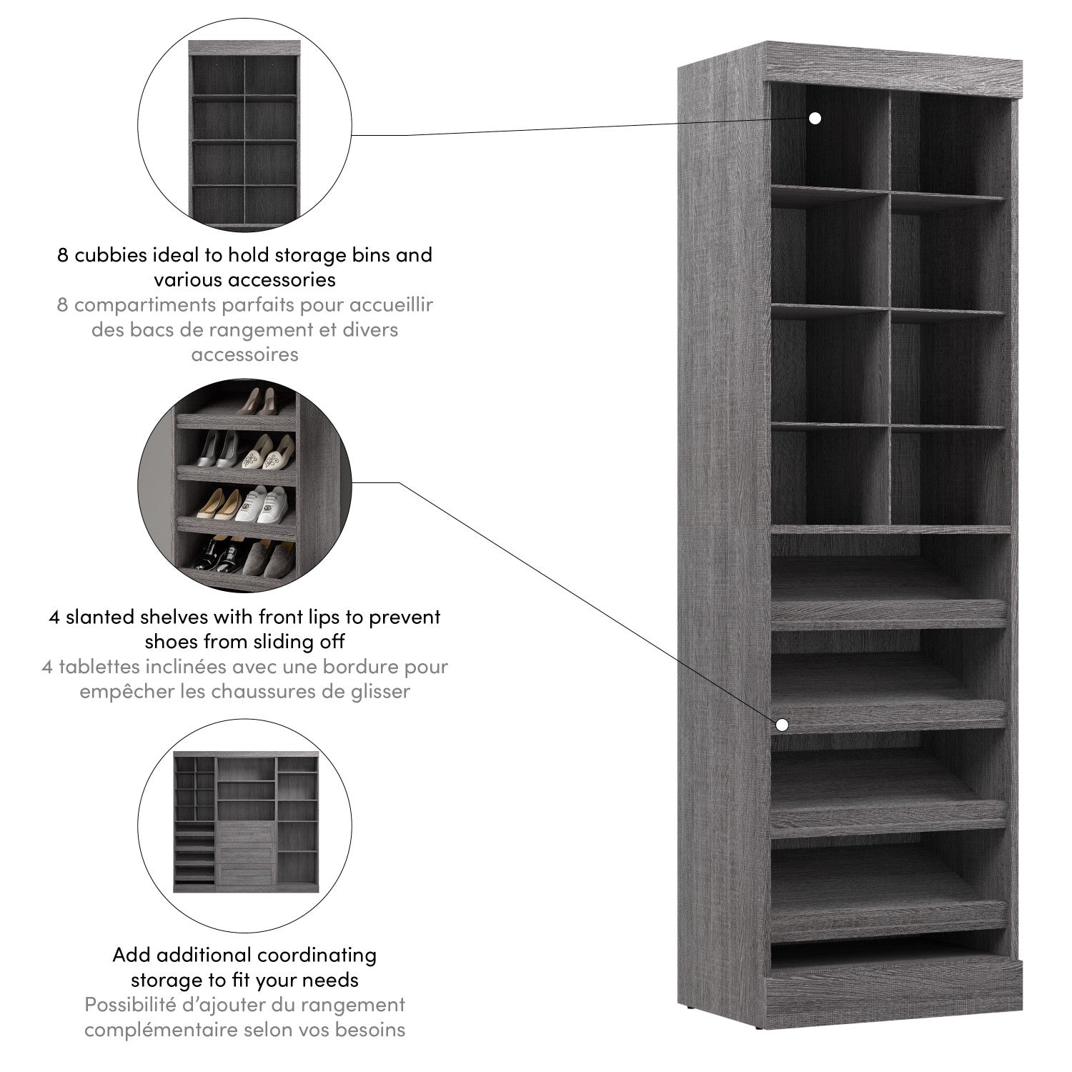 The Bestar Pur 25W Closet Shoe Organizer is the perfect solution to keep your shoes and accessories organized with style. Thanks to its compact design, it fits easily into the room of your choice. Use this shoe organizer in your closet, bedroom, or entryway to keep everything you need to get ready in full view and close at hand. Get your home in order with eight cubbies that are perfectly sized to hold storage bins, or use them for easy access to hats, bags, gloves, and more. Four spacious slanted shelves feature front lips to prevent items from sliding off, making them a great location to display your large shoe collection, or even handbags or clothes. Designed for use as a standalone closet organizer or as part of a larger configuration when paired with coordinating items from the Pur Collection (sold separately), this small closet organizer provides ample opportunities for keeping your home in order without overwhelming your floor space. This piece is an essential if you have a walk-in closet. It offers all the shoe storage you need. This shoe cabinet is backed by the Bestar 10 Year Manufacturer’s Warranty. North American made with globally sourced materials.