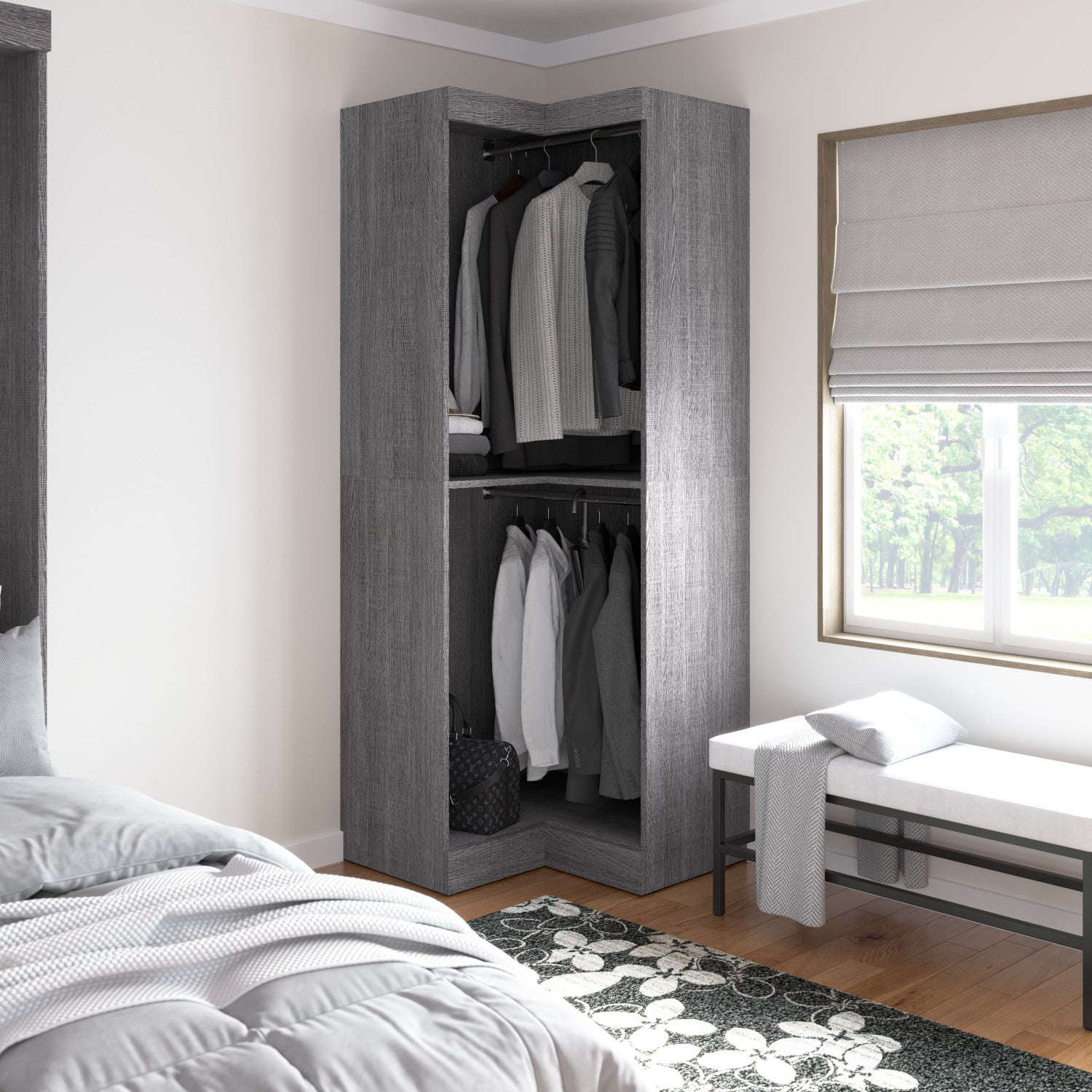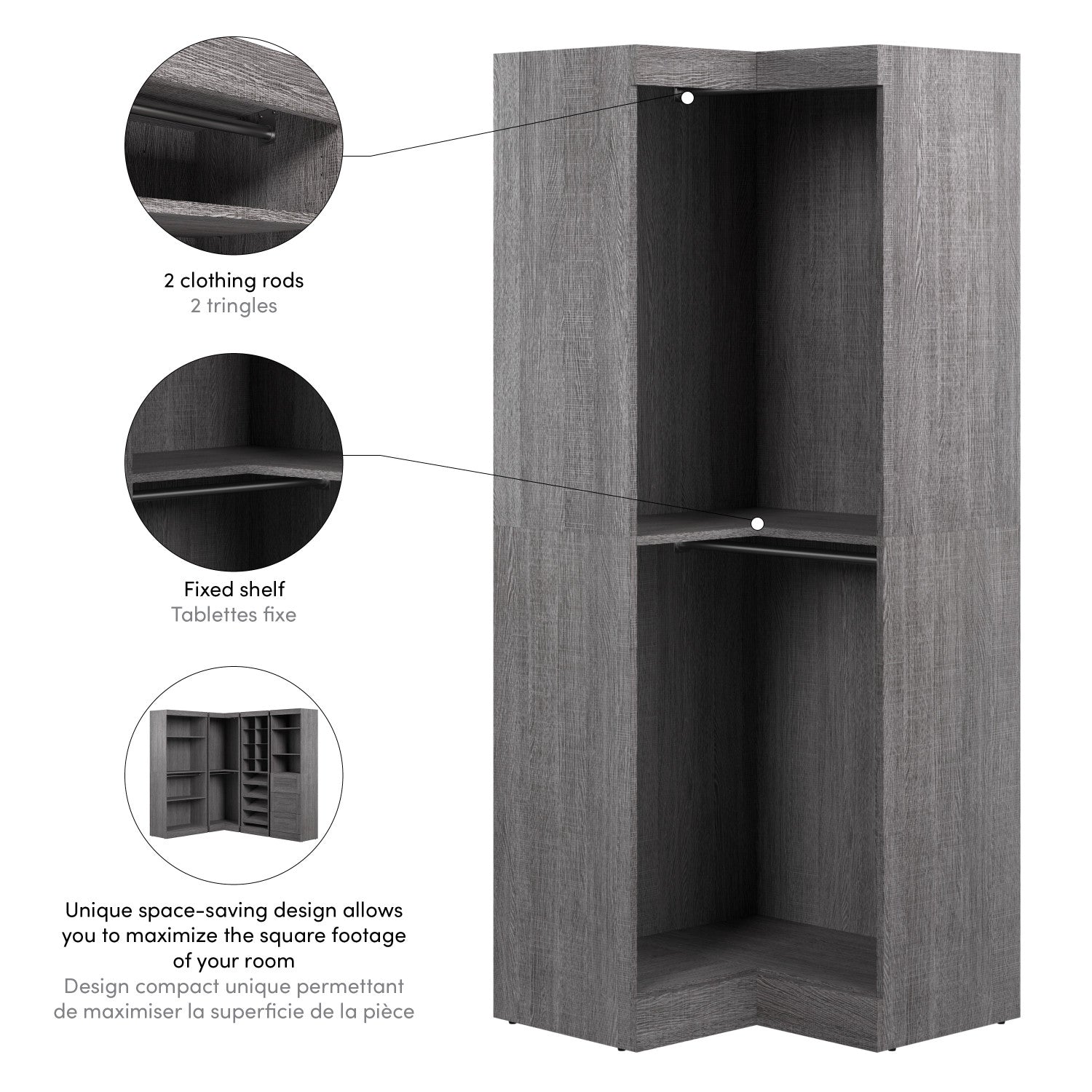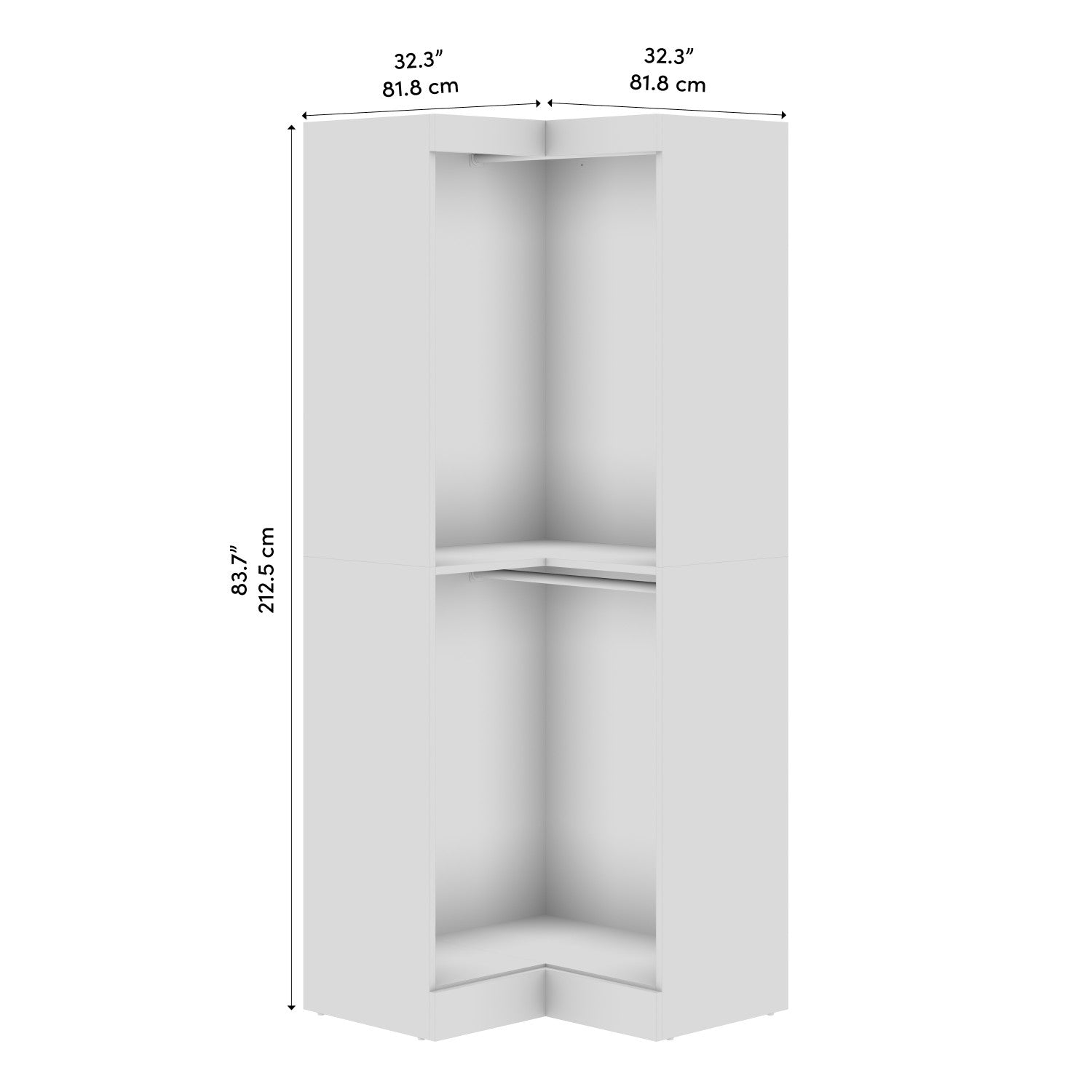 Get your home in order with the Bestar Pur 33W Corner Closet Organizer. Use every square inch of your space thanks to this ingenious closet system. Perfect for organizing your existing closet or turning the corner of any room into one, the organizer features one fixed shelf for stacking storage bins, bags, or clothing. Keep your favorite pants, shirts, dresses, and more in perfect condition with 2 spacious clothing rods, one above the fixed shelf and one below. The corner design creatively provides enough storage to organize your clothes without taking over your floor space. Thanks to its sleek look, the wardrobe storage will blend seamlessly into your current home decor. You can place it in your closet, your bedroom, your entryway, or your laundry room to dry clothes, hang coats and jackets, or any other clothing item. If you’re in need of additional clothing organization, add on to the corner organizer with coordinating storage pieces from the Pur Collection (sold separately) for a larger configuration. This is just the piece you need to create an L or U shaped walk-in closet configuration. This closet storage solution is backed by the Bestar 10 Year Manufacturer’s Warranty. North American made with globally sourced materials.