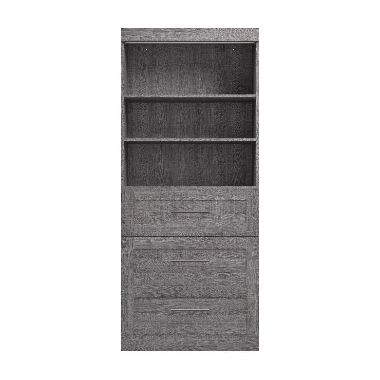 The Bestar Pur 36W Closet Organizer with Drawers is the perfect storage solution for a crowded closet, a modest bedroom, or a small laundry room. The drawers’ shaker-inspired trim and metal handles offer a transitional styling that is sure to complement your space. Place the closet system in your bedroom to organize your clothes and accessories and keep your nicest dresses, shirts, or dress pants wrinkle free. Get your mudroom in order with clothing rods to hang your coats and jackets, and shelves and drawers to store your hats, bags, gloves, and other essentials. Or, use it in your laundry room to air dry your clothing and store fresh towels and spare sheets. Simply remove some of the adjustable shelves to customize the unit to suit your needs. The shaker-style drawers glide on smooth ball bearing slides for an easy open and close. Designed for use as a standalone closet organizer or as part of a larger configuration when paired with coordinating items from the Pur Collection (sold separately), the storage cabinet provides ample opportunities for keeping your home in order without overwhelming your floor space. This shelving unit also looks great when paired with a Murphy Bed from the same collection. This storage cabinet is backed by the Bestar 10 Year Manufacturer’s Warranty. North American made with local and imported parts.
