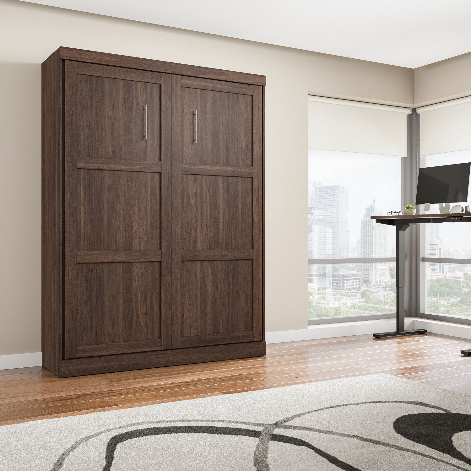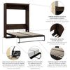 The Bestar Pur 65W Queen Murphy Bed is the ideal space saver for a multipurpose room. Easily transform your home gym or office into a guest room. The mattress support uses flexible slats that follow the curves of the body and absorb pressure for maximum comfort. The Queen Murphy bed can be used every night, and it folds up and down smoothly and quickly thanks to the dual piston system. Choose your own mattress since the bed accommodates most standard Queen mattresses (8-12 inches thick, 60-90 lb, 60 x 80 inches) and supports up to 1000 lb (including mattress). The open bed extends 92 inches from the wall. Allow a clearance of 30-36 inches around the open bed. The dual-mount wall bed mechanism attaches to the floor and wall for ease of assembly and maximum stability and durability. To avoid risk of injury, the Murphy bed must be installed to wall and floor structure by a professional or qualified person. Two people are required for assembly. Installation requires attachment to wood studs or masonry, removal of the baseboard, and drilling into the floor (if disassembly is required, holes may be covered with baseboards 0.5 inches or thicker). All necessary hardware is included. The cabinet must be anchored to a wall with a minimum ceiling height of 91.1 inches. Do not use this product for children or pets under 50 pounds (22.7 kg). The Murphy Bed is backed by the Bestar 10 Year Manufacturer’s Warranty. North American made with globally sourced materials.