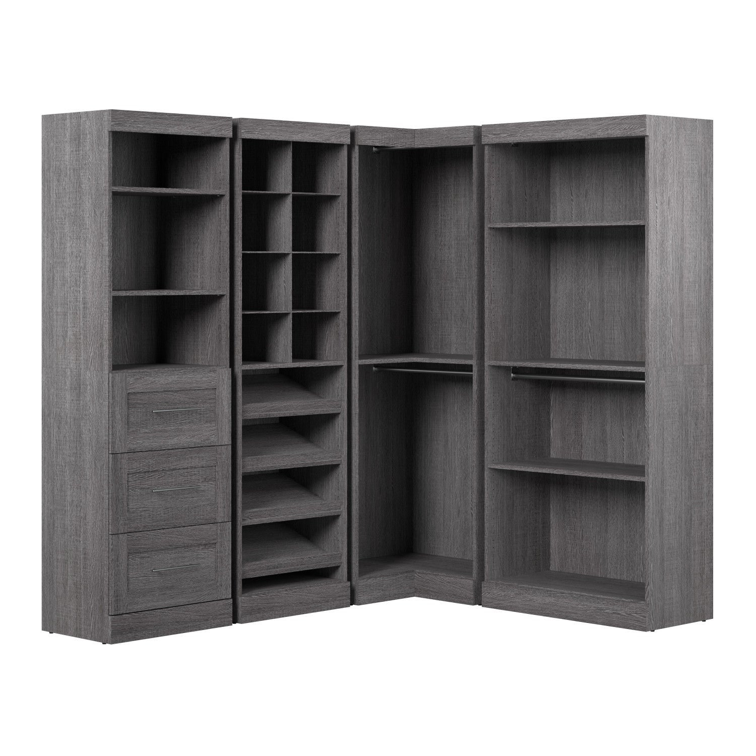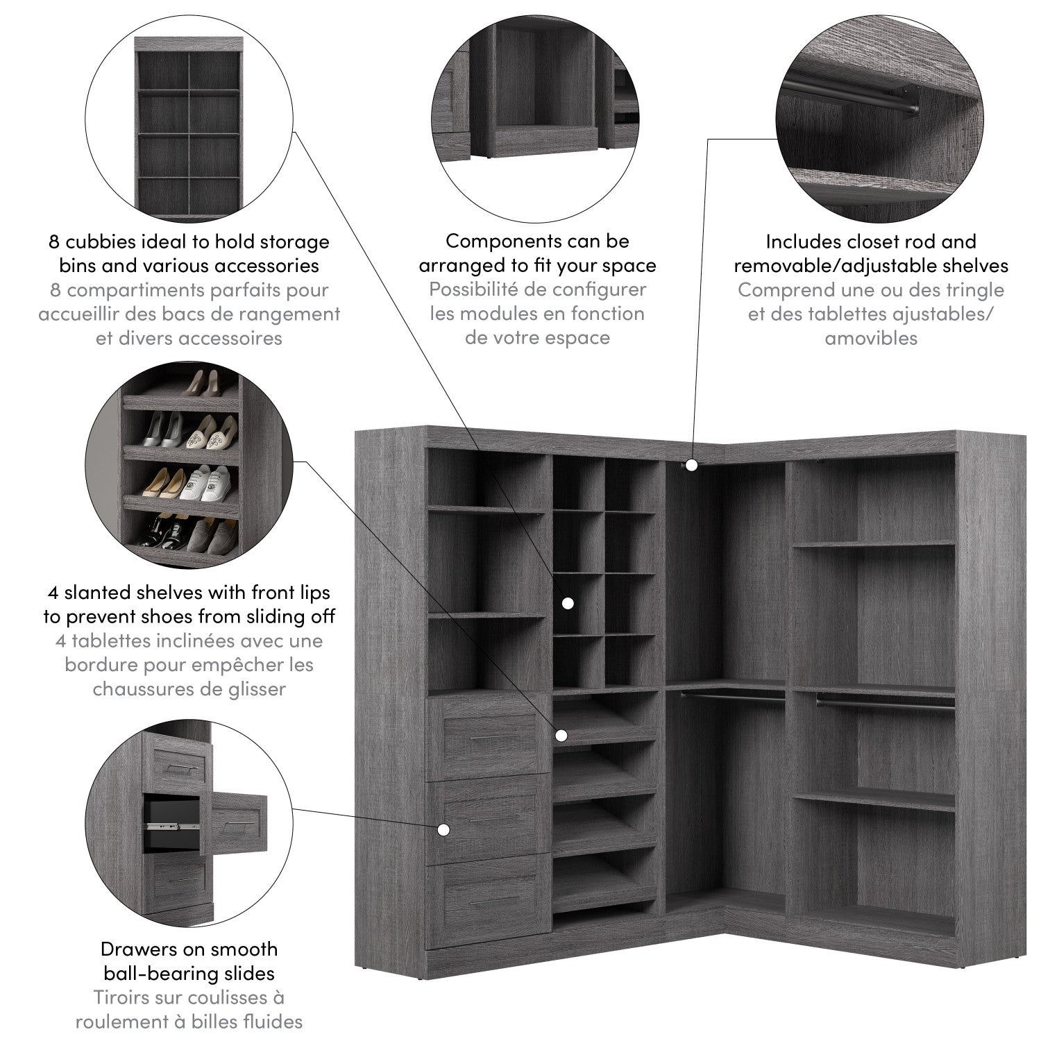 The Bestar Pur 83W Walk-In Closet Organizer offers all the closet storage you need. With a mix of open and concealed storage, you can display your nicest outfits and keep your personal belongings out of sight. The stylish shaker-style drawers and functional shelves will help you organize your walk-in closet in no time. You can use the closet system as one piece or use each shelving unit separately. The closet organizer includes clothing rods, with two in the corner storage piece, as well as fixed and adjustable shelves, and drawers that glide on smooth ball-bearing slides for an effortless reach to all of your clothing and accessories. Move the shelves as you see fit to accommodate items of various sizes. You can also place bins and baskets on the shelves to hide clutter. The shoe closet organizer features a combination of cubbies for storage bins and spacious slanted shelves with lips to prevent items like shoes, handbags and clothes from sliding off. The shoe cabinet is perfect to organize your large shoe collection. The closet drawers come with metal handles and a shaker-inspired trim for a lovely transitional design that beautifully complements a variety of home decor styles. This walk-in closet organizer is backed by the Bestar 10 Year Manufacturer’s Warranty. North American made with local and imported parts.