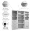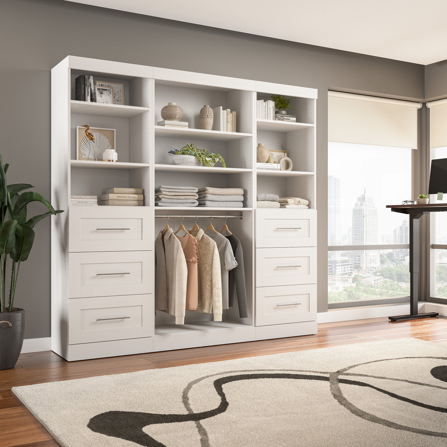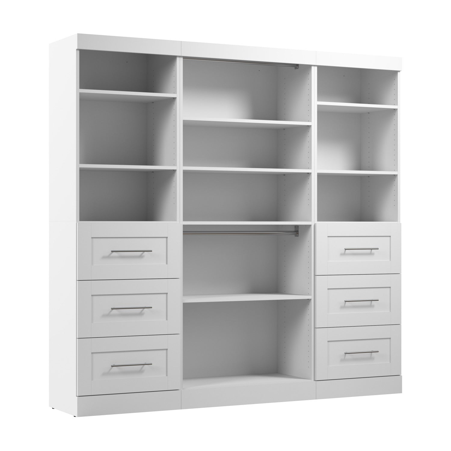 The Bestar Pur 86W Closet Organization System allows you to organize your entire wardrobe with style. With a mix of open and concealed storage, you can display your favorite outfits and keep personal items out of sight. The drawers open on smooth ball-bearing slides for an easy reach to your belongings. The open shelving is perfect for storage baskets, decorative items, books, and other accessories. Thanks to the clothing rods, you can keep your favorite clothes wrinkle free and easily accessible. You can customize your storage options to meet your needs by moving the adjustable shelves to accommodate bags, and items of various sizes. The closet organizer system is perfect for a walk-in closet but can also be used against a wall in your bedroom, guest room or even in the hallway or entryway. The pieces can also be used separately for a customized configuration. Upgrade your clothing storage by replacing or pairing your dresser with this stylish wardrobe organizer. The drawers’ shaker-inspired trim and metal handles create a transitional styling that enhances your home decor. This closet organizer is backed by the Bestar 10 Year Manufacturer’s Warranty. North American made with local and imported parts.