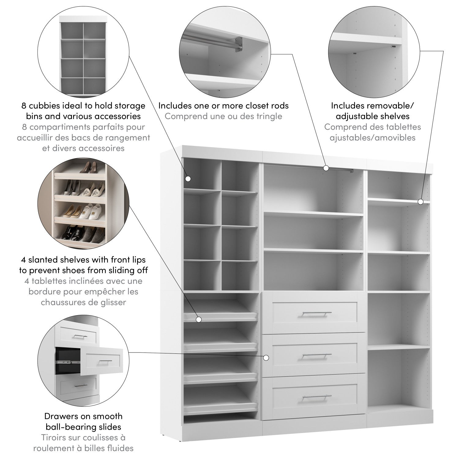 The Bestar Pur 86W Closet Organizer System is perfect to create your dream closet anywhere you like. With ingenious shoe storage, spacious drawers, practical clothing rods, and adjustable shelving, this organizer offers efficient and versatile closet storage. It’s ideal for a walk-in closet but can also be used against a wall in your bedroom, guest room or even in the hallway next to your room. This clothes organizer also makes a great entryway storage solution. The pieces can be used separately for a customized configuration that suits your needs and your space. If your dresser or small closet is not cutting it anymore, it’s time to upgrade your clothing storage with this stylish wardrobe organizer. Hang your favorite outfits on the clothing rod and store other clothing items and personal belongings in the closet drawers. Move the shelves as you see fit to accommodate bags and decor items of various sizes. The shoe closet organizer features a combination of cubbies for storage bins and spacious slanted shelves with lips to prevent items like shoes, handbags, and clothes from sliding off. The shoe cabinet is perfect to organize your shoe collection. The closet drawers come with metal handles and a shaker-inspired trim for a beautiful transitional design that will perfectly complement your home decor. This closet system is backed by the Bestar 10 Year Manufacturer’s Warranty. North American made with local and imported parts.