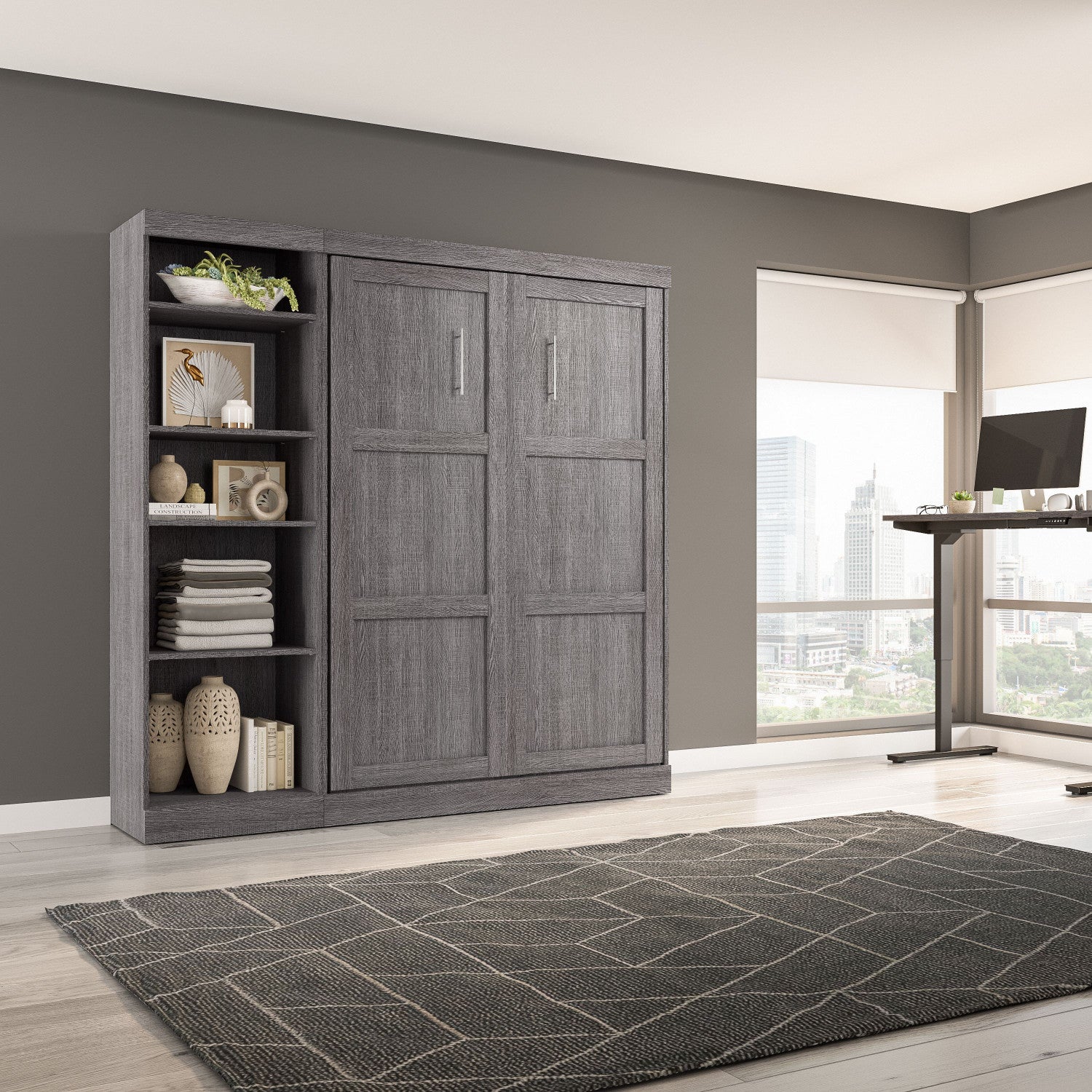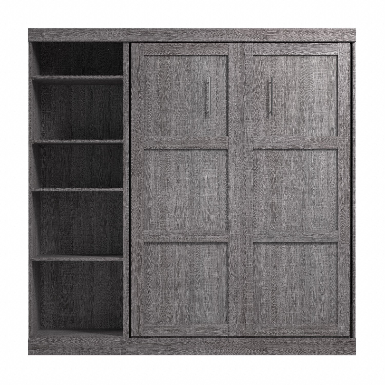 The Bestar Pur Full Murphy Bed with Shelving Unit (84W) is the ideal space saver for a multipurpose room. The mattress support uses flexible slats that follow the curves of the body and absorb pressure for maximum comfort. The Full Murphy bed can be used every night for a good night’s sleep. The bed folds up and down smoothly within seconds thanks to the dual piston system. The wall bed accommodates most standard Full mattresses (8-10 inches thick, 60-90 lb, 54 x 75 inches) and supports up to 1000 lb (including mattress). The open bed extends 84. 9 inches from the wall. The cabinet must be anchored to a wall with a minimum ceiling height of 86. 4 inches. Allow a clearance of 30-36 inches around the open bed. The complementary shelving unit comes with 2 fixed and 3 adjustable shelves to hold your belongings. The dual-mount wall bed mechanism attaches to the floor and wall for maximum stability and durability. To avoid risk of injury, the bed must be installed to wall and floor structure by a professional or qualified person. Two people are required for assembly. Installation requires attachment to wood studs or masonry, removal of the baseboard, and drilling into the floor (if disassembly is required, holes may be covered with baseboards 0. 5 inches or thicker). All necessary hardware is included. Do not use this product for children or pets under 50 pounds (22. 7 kg). Backed by the Bestar 10 Year Manufacturer’s Warranty. North American made with globally sourced materials.