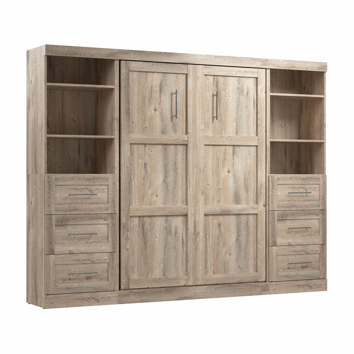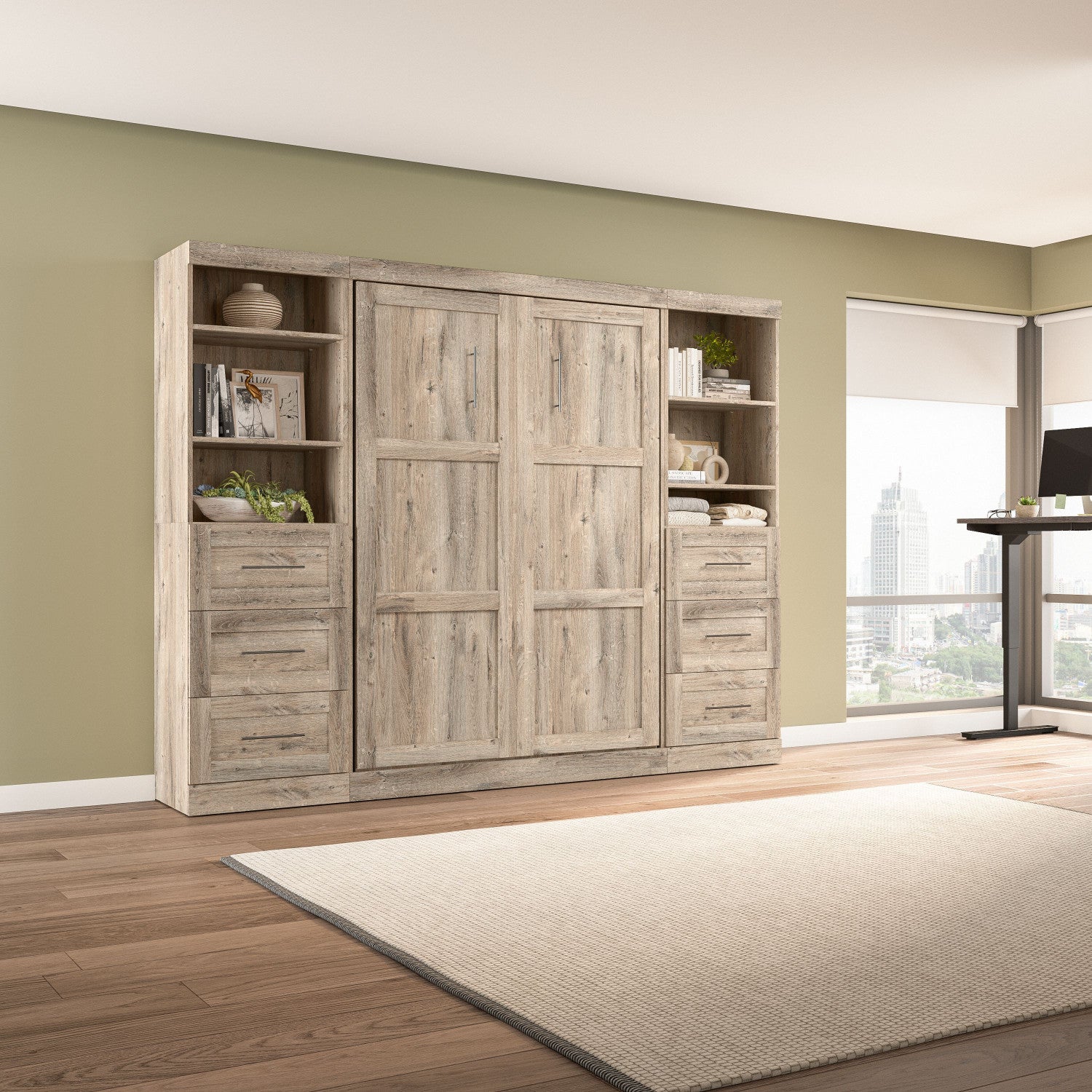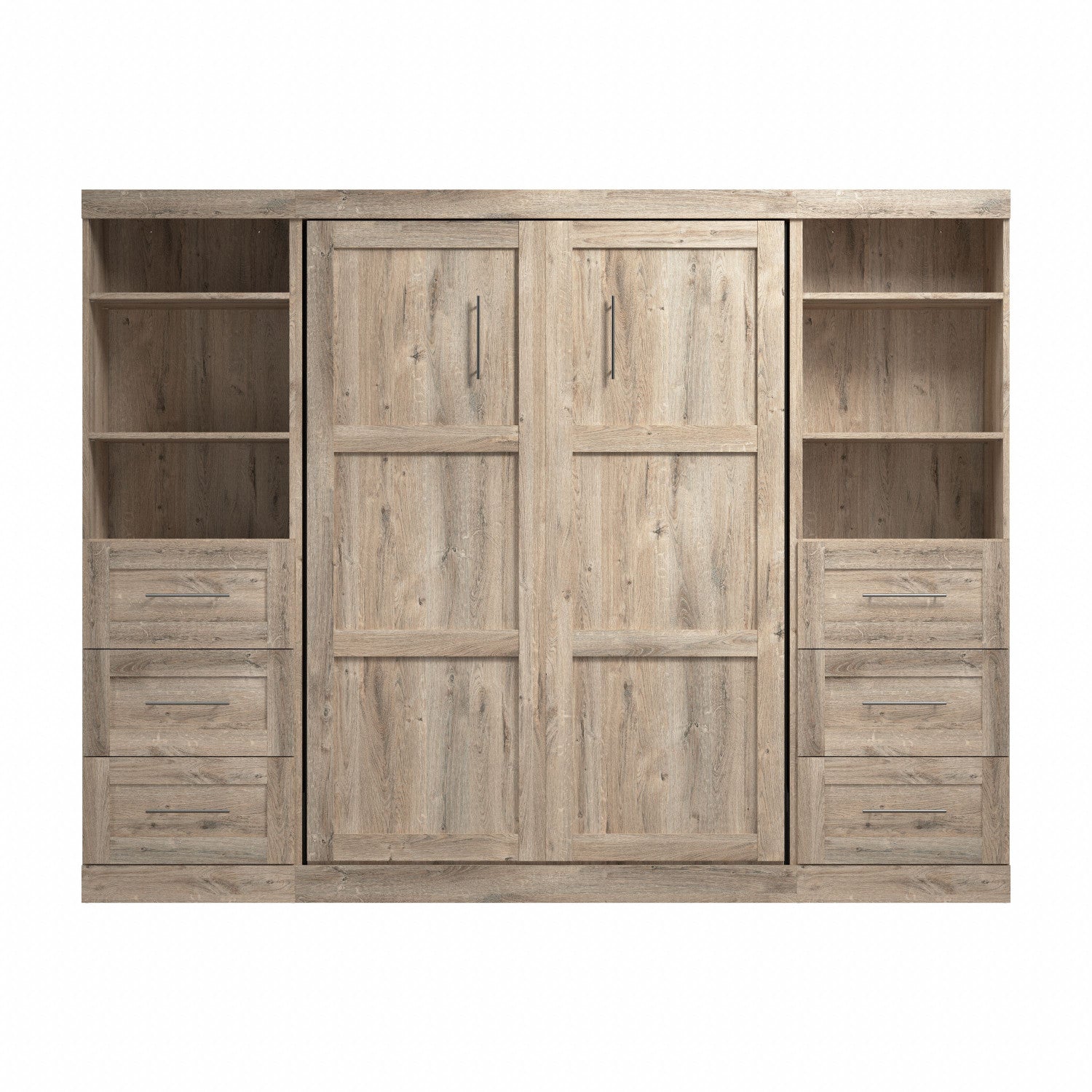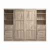 The Bestar Pur Full Murphy Bed and 2 Shelving Units with Drawers (109W) is the ideal space saver for a multipurpose room. The mattress support uses flexible slats that follow the curves of the body and absorb pressure for maximum comfort. The Full Murphy bed folds up and down smoothly thanks to the dual piston system. The wall bed can be used every night for a good night’s sleep. The bed accommodates most standard Full mattresses (8-10 inches thick, 60-90 lb, 54 x 75 inches) and supports up to 1000 lb (including mattress). The open bed extends 84. 9 inches from the wall. The cabinet must be anchored to a wall with a minimum ceiling height of 86. 4 inches. Allow a clearance of 30-36 inches around the open bed. Shelving units come with 2 fixed and 3 adjustable shelves, plus 3 drawers to hold your belongings. The dual-mount wall bed mechanism attaches to the floor and wall for maximum stability and durability. To avoid risk of injury, the Murphy bed must be installed to wall and floor structure by a professional or qualified person. Two people are required for assembly. Installation requires attachment to wood studs or masonry, removal of the baseboard, and drilling into the floor (if disassembly is required, holes may be covered with baseboards 0. 5 inches or thicker). All necessary hardware is included. Do not use this product for children or pets under 50 pounds (22. 7 kg). Backed by the Bestar 10 Year Manufacturer’s Warranty. North American made with globally sourced materials.