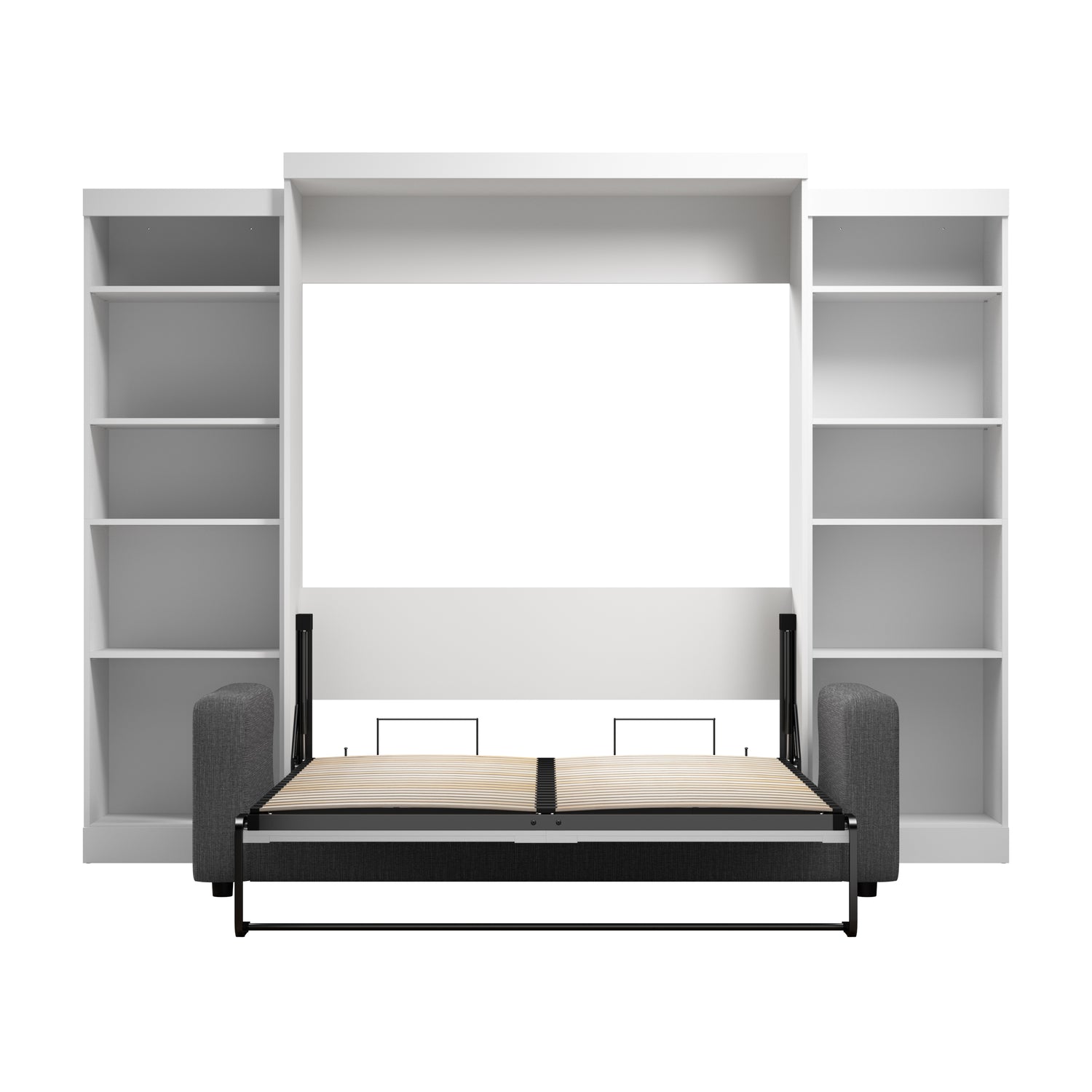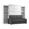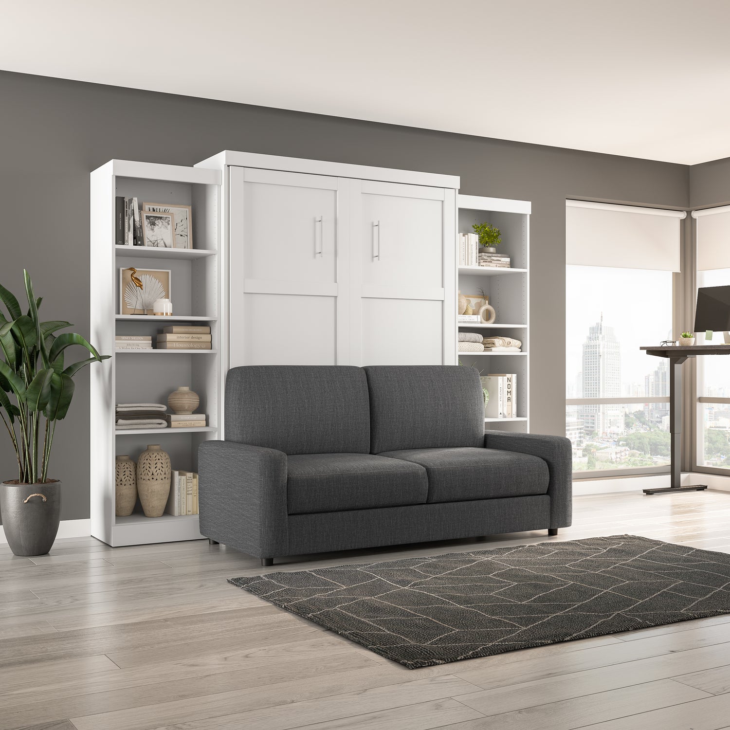 The Bestar Pur Queen Murphy Bed with Sofa and Shelving Units (115W) is the perfect solution for a multipurpose room. Add style and functionality to your living room or guest room with this Murphy bed set. This bundle offers you a place to sleep and to sit, as well as storage space for your belongings. The shaker-inspired trim and metal handles offer transitional styling that works well with any decor. Sit comfortably during the day and simply remove the cushions and fold out the wall bed to sleep at night. The mattress support uses flexible slats for maximum comfort. The bed accommodates most standard Queen mattresses. The cabinet must be anchored to a wall with a minimum ceiling height of 91. 1 inches. The open bed extends 92 inches from the wall. The dual-mount wall bed mechanism attaches to the floor and wall for maximum stability and durability. To avoid risk of injury, the bed must be installed to wall and floor structure by a professional or qualified person. Two people are required for assembly. Installation requires attachment to wood studs or masonry, removal of the baseboard, and drilling into the floor (if disassembly is required, holes may be covered with baseboards 0. 5 inches or thicker). Necessary hardware is included. Do not use this product for children or pets under 50 pounds (22. 7 kg). This Queen Murphy bed is backed by the Bestar 10 Year Manufacturer’s Warranty, the sofa is warranted 1 year. North American made with globally sourced materials.