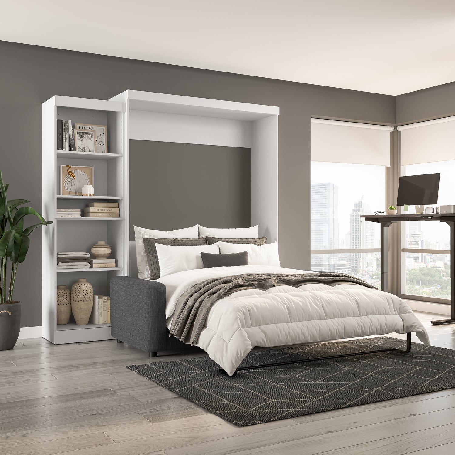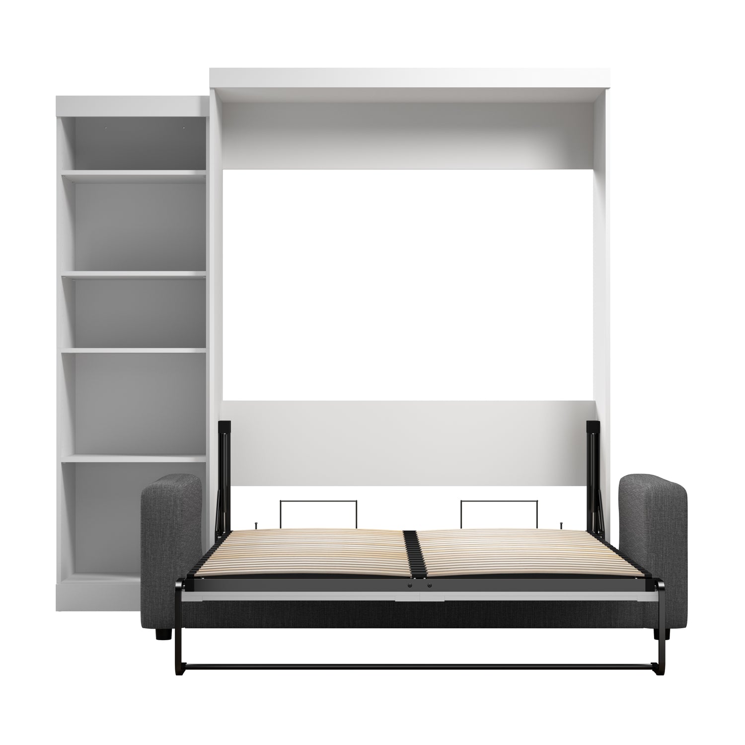 The Bestar Pur Queen Murphy Bed with Sofa and Shelving Unit (96W) is perfect for a multipurpose room. Make the most out of your living room with this stylish Murphy bed set. It offers a comfortable place to sit during the day and to sleep at night. Simply remove the cushions and fold out the wall bed for a good night’s sleep. You can display your favorite decorations in the shelving unit. The shaker-inspired trim and metal handles offer transitional styling that is sure to complement any decor. The mattress support uses flexible slats for maximum comfort. The bed accommodates most standard Queen mattresses. The cabinet must be anchored to a wall with a minimum ceiling height of 91. 1 inches. The open bed extends 92 inches from the wall. The dual-mount wall bed mechanism attaches to the floor and wall for maximum stability and durability. To avoid risk of injury, the bed must be installed to wall and floor structure by a professional or qualified person. Two people are required for assembly. Installation requires attachment to wood studs or masonry, removal of the baseboard, and drilling into the floor (if disassembly is required, holes may be covered with baseboards 0. 5 inches or thicker). All necessary hardware is included. Do not use this product for children or pets under 50 pounds (22. 7 kg). This Queen Murphy bed is backed by the Bestar 10 Year Manufacturer’s Warranty, the sofa is warranted 1 year. North American made with globally sourced materials.