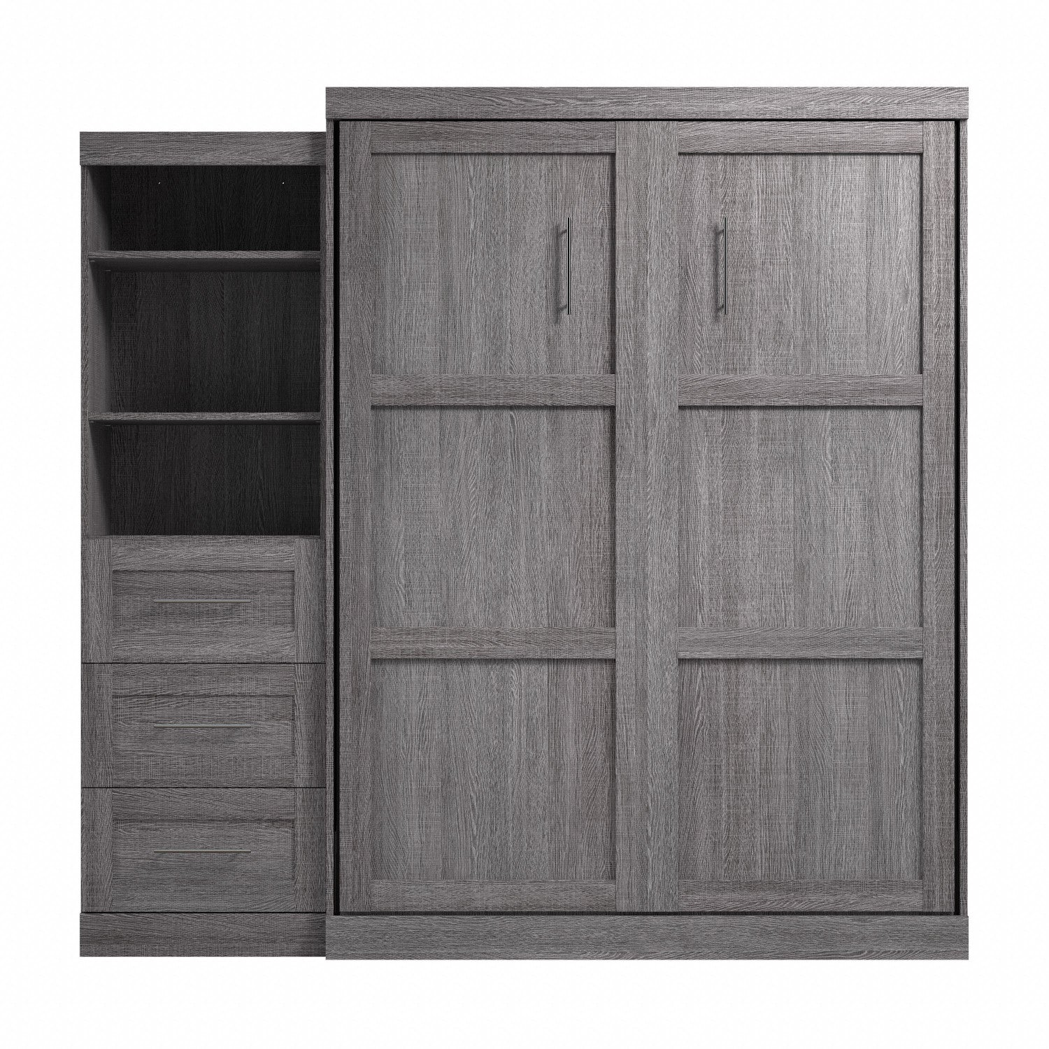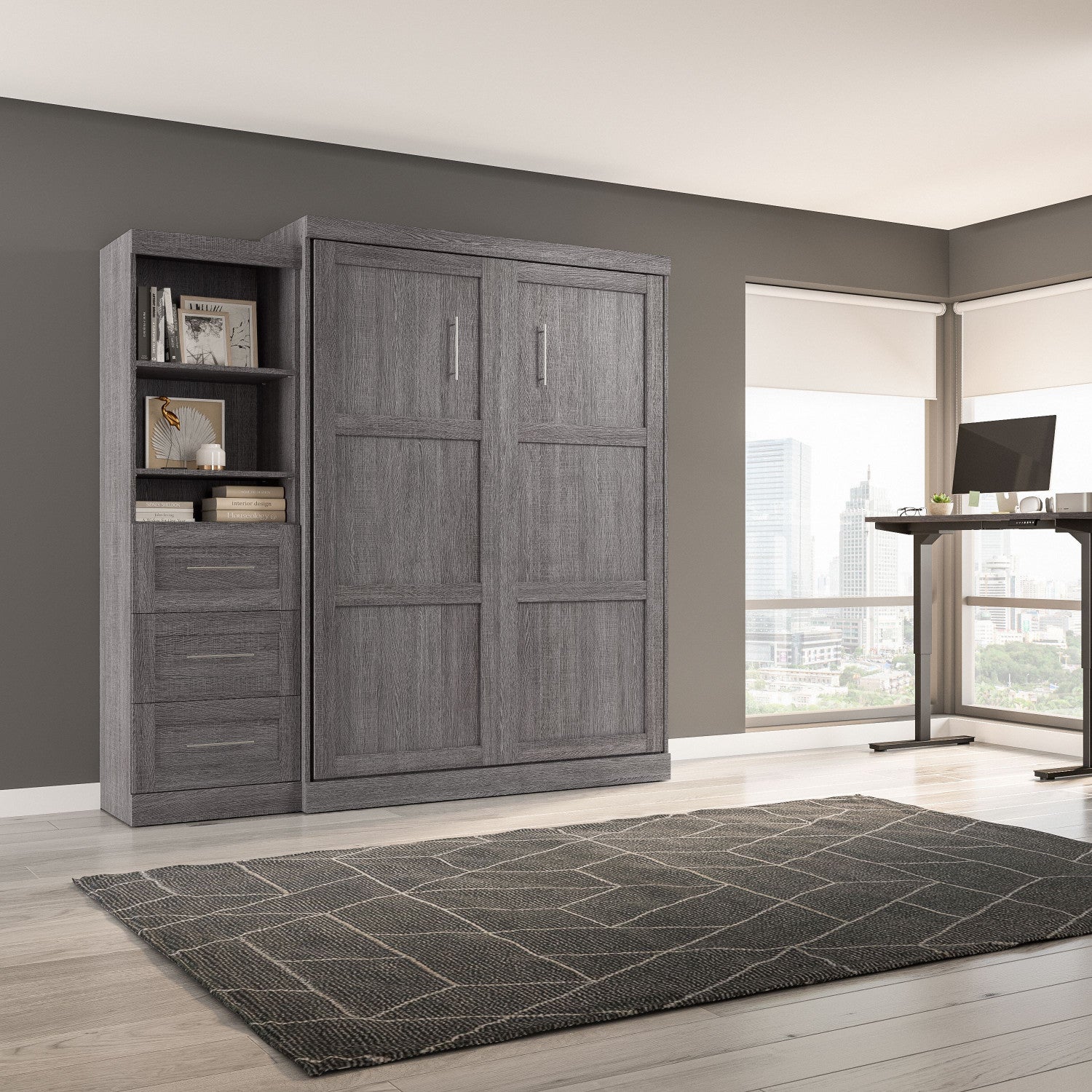 The Bestar Pur Queen Murphy Bed and Shelving Unit with Drawers (90W) is the ideal space saver. The mattress support uses flexible slats that follow the curves of the body and absorb pressure. The Queen Murphy bed can be used every night for a good night’s sleep. The bed folds up and down smoothly thanks to the dual piston system. The wall bed accommodates most standard Queen mattresses (8-12 inches thick, 60-90 lb, 60 x 80 inches) and supports up to 1000 lb (including mattress). The open bed extends 92 inches from the wall. The cabinet must be anchored to a wall with a minimum ceiling height of 91. 1 inches. Allow a clearance of 30-36 inches around the open bed. The shelving unit comes with 2 fixed and 3 adjustable shelves, and 3 drawers to hold your belongings. The dual-mount wall bed mechanism attaches to the floor and wall for ease of assembly and maximum stability and durability. To avoid risk of injury, the Murphy bed must be installed to wall and floor structure by a professional or qualified person. Two people are required for assembly. Installation requires attachment to wood studs or masonry, removal of the baseboard, and drilling into the floor (if disassembly is required, holes may be covered with baseboards 0. 5 inches or thicker). All necessary hardware is included. Do not use this product for children or pets under 50 pounds (22. 7 kg). This bedroom set is backed by the Bestar 10 Year Manufacturer’s Warranty. North American made with globally sourced materials.