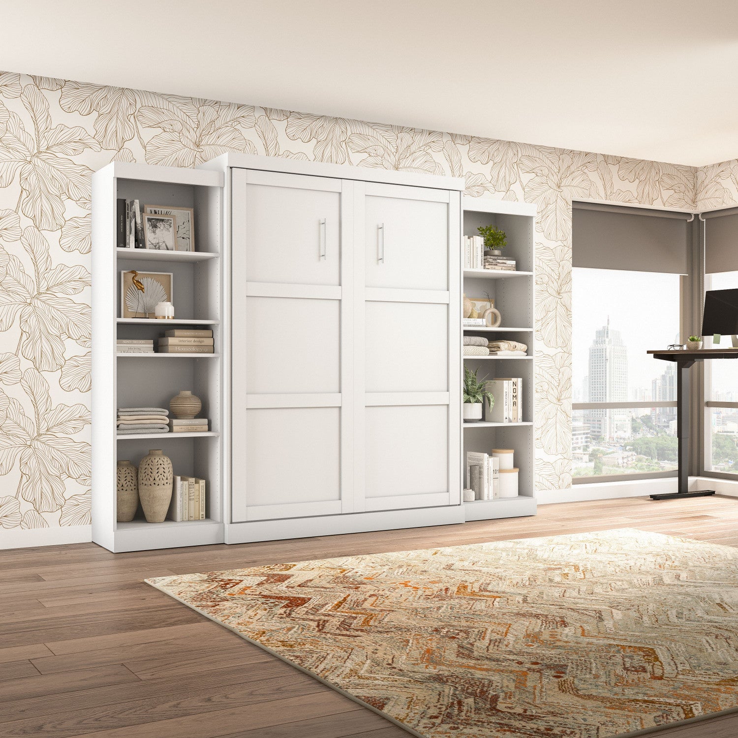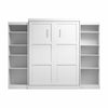 The Bestar Pur Queen Murphy Bed and 2 Shelving Units (115W) is the ideal space saver for a multipurpose room. The mattress support uses flexible slats that follow the curves of the body and absorb pressure for maximum comfort. The Queen Murphy bed can be used every night for a good night’s sleep. The bed folds up and down smoothly within seconds. The wall bed accommodates most standard Queen mattresses (8-12 inches thick, 60-90 lb, 60 x 80 inches) and supports up to 1000 lb (including mattress). The open bed extends 92 inches from the wall. The cabinet must be anchored to a wall with a minimum ceiling height of 91. 1 inches. Allow a clearance of 30-36 inches around the open bed. Both shelving units come with 2 fixed and 3 adjustable shelves to hold your belongings. The dual-mount wall bed mechanism attaches to the floor and wall for ease of assembly and maximum stability and durability. To avoid risk of injury, the Murphy bed must be installed to wall and floor structure by a professional or qualified person. Two people are required for assembly. Installation requires attachment to wood studs or masonry, removal of the baseboard, and drilling into the floor (if disassembly is required, holes may be covered with baseboards 0. 5 inches or thicker). All necessary hardware is included. Do not use this product for children or pets under 50 pounds (22. 7 kg). Backed by the Bestar 10 Year Manufacturer’s Warranty. North American made with globally sourced materials.