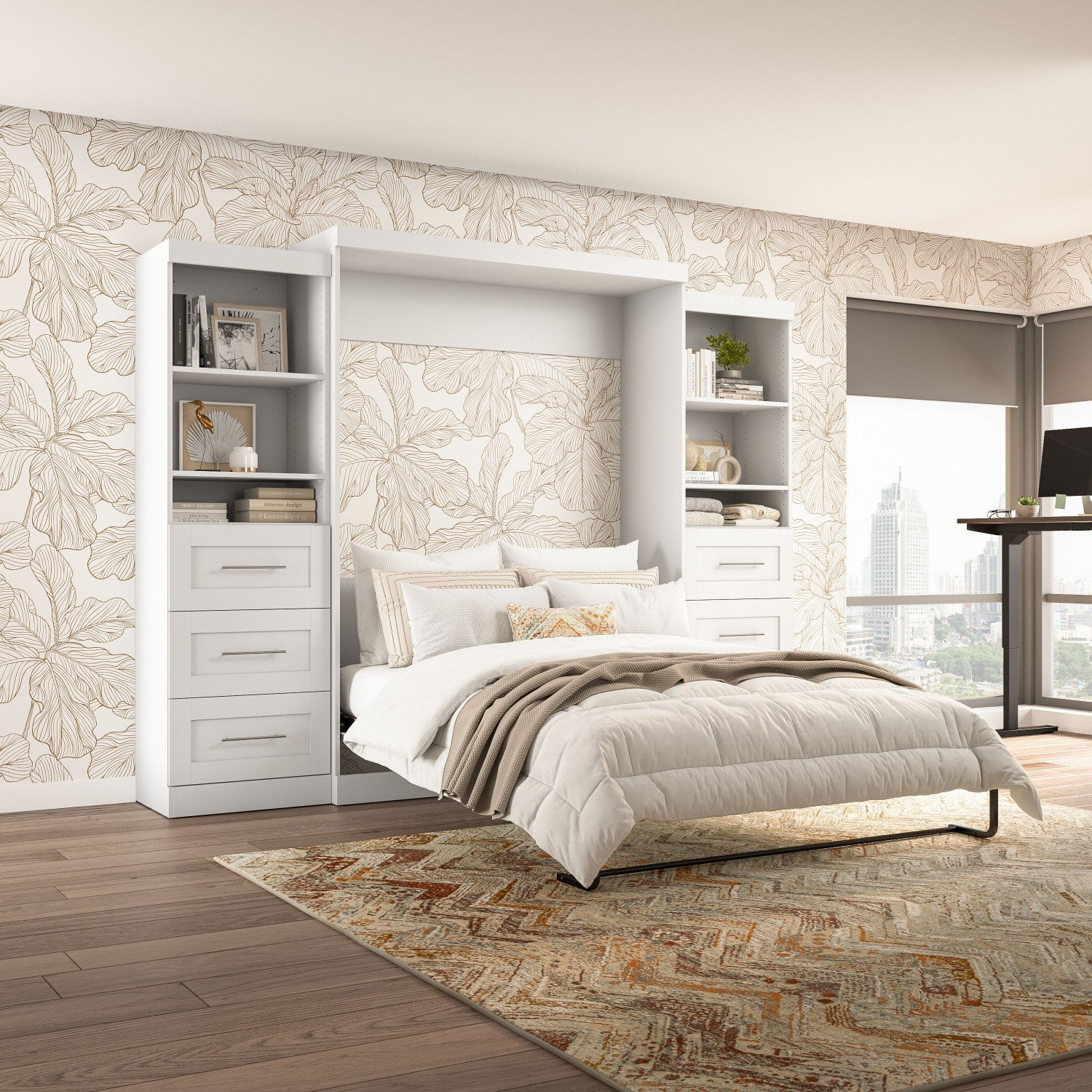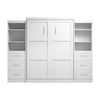 The Bestar Pur Queen Murphy Bed and 2 Shelving Units with Drawers (115W) is the ideal space saver for a multipurpose room. The mattress support uses flexible slats that follow the curves of the body and absorb pressure for maximum comfort. The Queen Murphy bed can be used every night for a good night’s sleep. The bed folds up and down smoothly thanks to the dual piston system. The wall bed accommodates most standard Queen mattresses (8-12 inches thick, 60-90 lb, 60 x 80 inches) and supports up to 1000 lb. The open bed extends 92 inches from the wall. The cabinet must be anchored to a wall with a minimum ceiling height of 91. 1 inches. Allow a clearance of 30-36 inches around the open bed. The shelving units come with 2 fixed and 3 adjustable shelves and 3 drawers to hold your belongings. The dual-mount wall bed mechanism attaches to the floor and wall for maximum stability and durability. To avoid risk of injury, the Murphy bed must be installed to wall and floor structure by a professional or qualified person. Two people are required for assembly. Installation requires attachment to wood studs or masonry, removal of the baseboard, and drilling into the floor (if disassembly is required, holes may be covered with baseboards 0. 5 inches or thicker). Necessary hardware is included. Do not use this product for children or pets under 50 pounds (22. 7 kg). This bundle is backed by the Bestar 10 Year Manufacturer’s Warranty. North American made with globally sourced materials.
