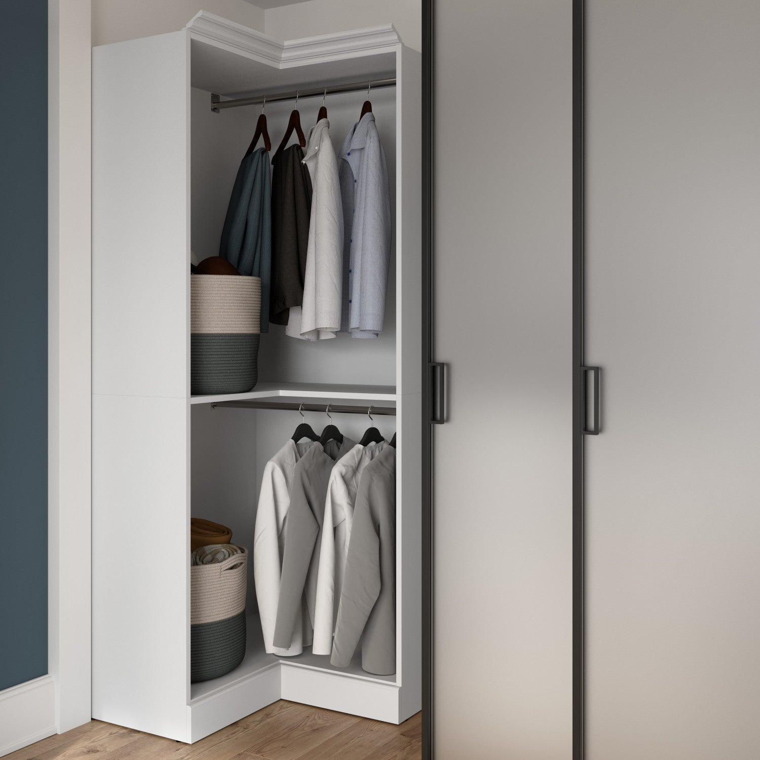 Get your home in order with the Bestar Versatile 36W Corner Closet Organizer. Use every square inch of your space thanks to this ingenious closet system. Perfect for organizing your existing closet or turning the corner of any room into one, the organizer features one fixed shelf for stacking storage bins, bags, or clothing. Keep your favorite pants, shirts, dresses, and more in perfect condition with 2 spacious clothing rods, one above the fixed shelf and one below. The corner design creatively provides enough storage to organize your clothes without taking over your floor space. Thanks to its sleek look, the wardrobe storage will blend seamlessly into your current home decor. You can place it in your closet, your bedroom, your entryway, or your laundry room to dry clothes, hang coats and jackets, or any other clothing item. If you’re in need of additional clothing organization, add on to the corner organizer with coordinating storage pieces from the Versatile Collection (sold separately) for a larger configuration. This is just the piece you need to create an L or U shaped walk-in closet configuration. Attractive crown moldings beautifully complement the elegant finish of your choice. This closet storage solution is backed by the Bestar 10 Year Manufacturer’s Warranty. North American made with globally sourced materials.