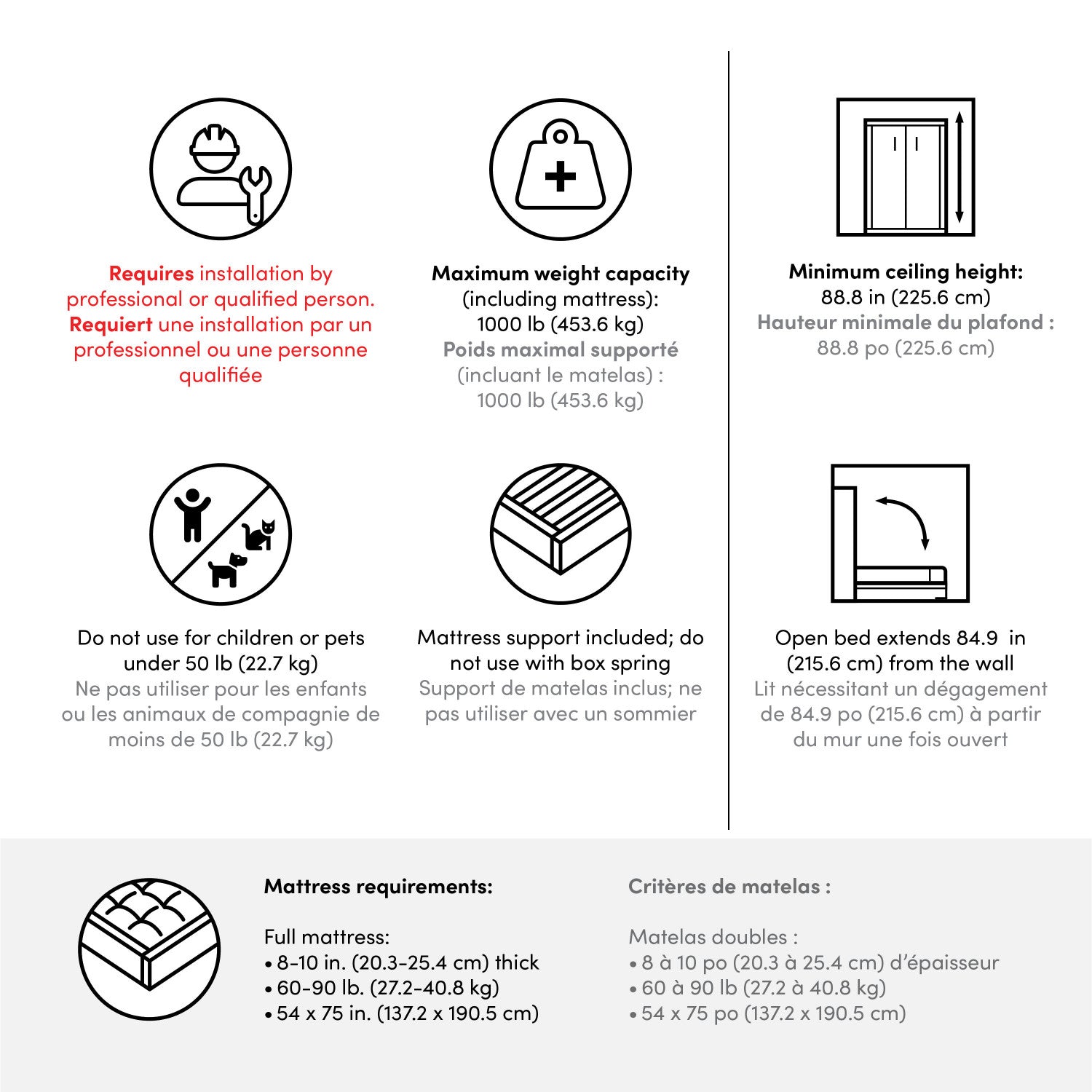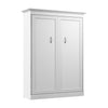The Bestar Versatile 64W Full Murphy Bed presents an ideal solution for creating a multipurpose room with traditional style. A dual piston system allows you to fold the full size Murphy bed down quickly and smoothly so you can sleep comfortably at night while enjoying your home office, gym, or living room during the daytime. The mattress support features flexible slats that follow the curves of the body and absorb pressure for maximum comfort. The cabinet bed accommodates most full size mattresses of your choosing and is designed to be used without a box spring. Antique Iron hardware and attractive crown moldings complement the elegant finish of your choice. The dual-mount wall bed mechanism attaches to both floor and wall structures for ease of assembly as well as maximum stability and durability. Minimum ceiling height is 88. 8 inches. The open bed extends 84. 9 inches from the wall. Maximum weight capacity is 1000 pounds including the mattress. To avoid risk of injury, the bed must be installed to the wall and floor structure by a professional or qualified person. Two people are required for assembly. Installation requires attachment to wood studs or masonry, removal of the baseboard, and drilling into the floor. Necessary hardware is included. Do not use this product for children or pets under 50 pounds (22. 7 kg). This full size wall bed is North American made with globally sourced materials and is backed by a 10 Year Warranty.