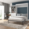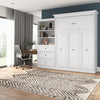 The Bestar Versatile Queen Murphy Bed and Closet Organizer with Drawers (103W) is the ideal space saver for a multipurpose room. The mattress support uses flexible slats that follow the curves of the body and absorb pressure for maximum comfort. The bed folds up and down smoothly within seconds. The wall bed accommodates most standard Queen mattresses (8-12 inches thick, 60-90 lb, 60 x 80 inches) and supports up to 1000 lb (including mattress). The open bed extends 92 inches from the wall. The cabinet must be anchored to a wall with a minimum ceiling height of 93. 8 inches. Allow a clearance of 30-36 inches around the open bed. Storage Cabinet features 2 fixed shelves, 3 adjustable/removable shelves, 2 clothing rods and 3 drawers to customize your closet organization. The dual-mount wall bed mechanism attaches to the floor and wall for ease of assembly and maximum stability and durability. To avoid risk of injury, the Murphy bed must be installed to wall and floor structure by a professional or qualified person. Two people are required for assembly. Installation requires attachment to wood studs or masonry, removal of the baseboard, and drilling into the floor (if disassembly is required, holes may be covered with baseboards 0. 5 inches or thicker). All necessary hardware is included. Do not use this product for children or pets under 50 pounds (22. 7 kg). Backed by the Bestar 10 Year Manufacturer’s Warranty. North American made with globally sourced materials.