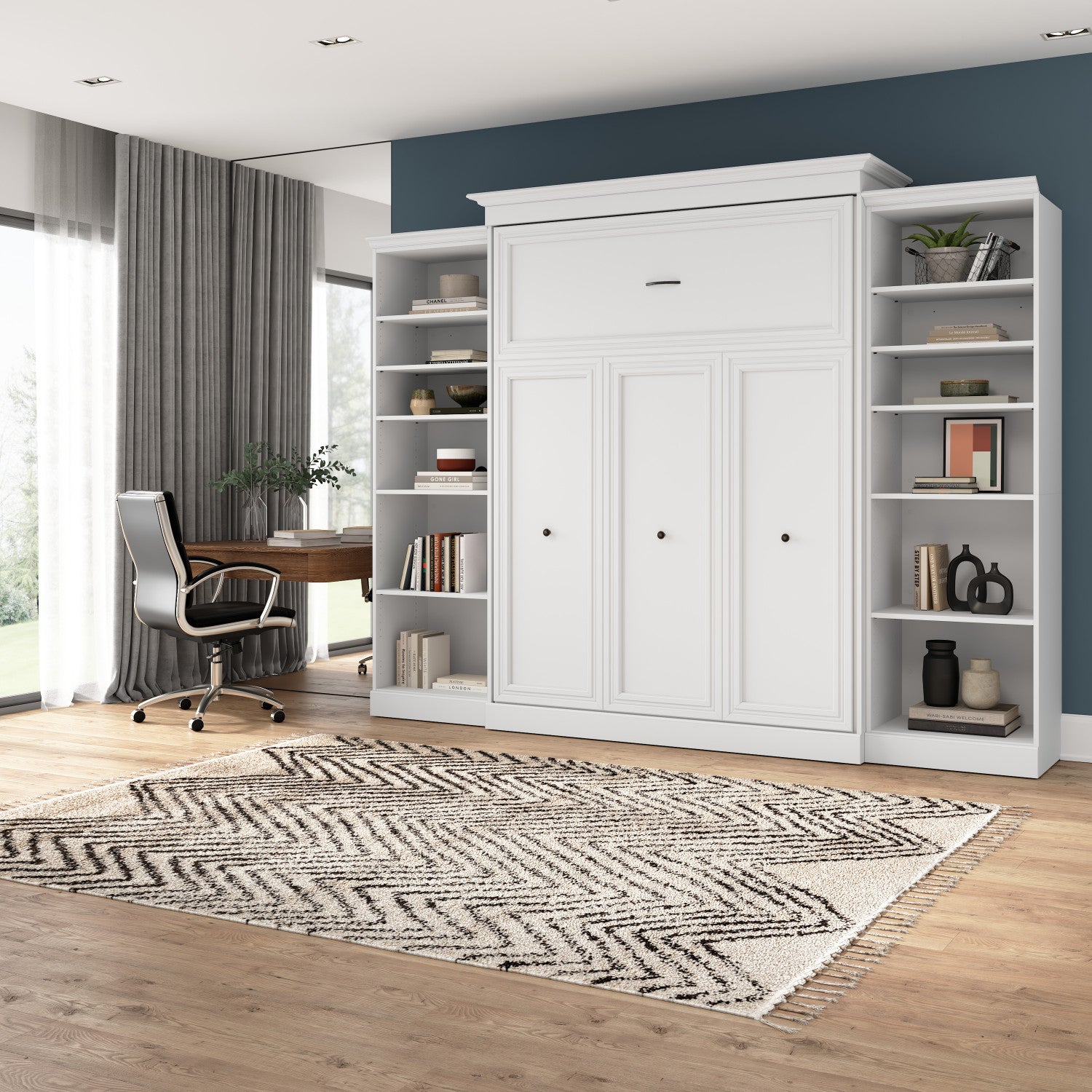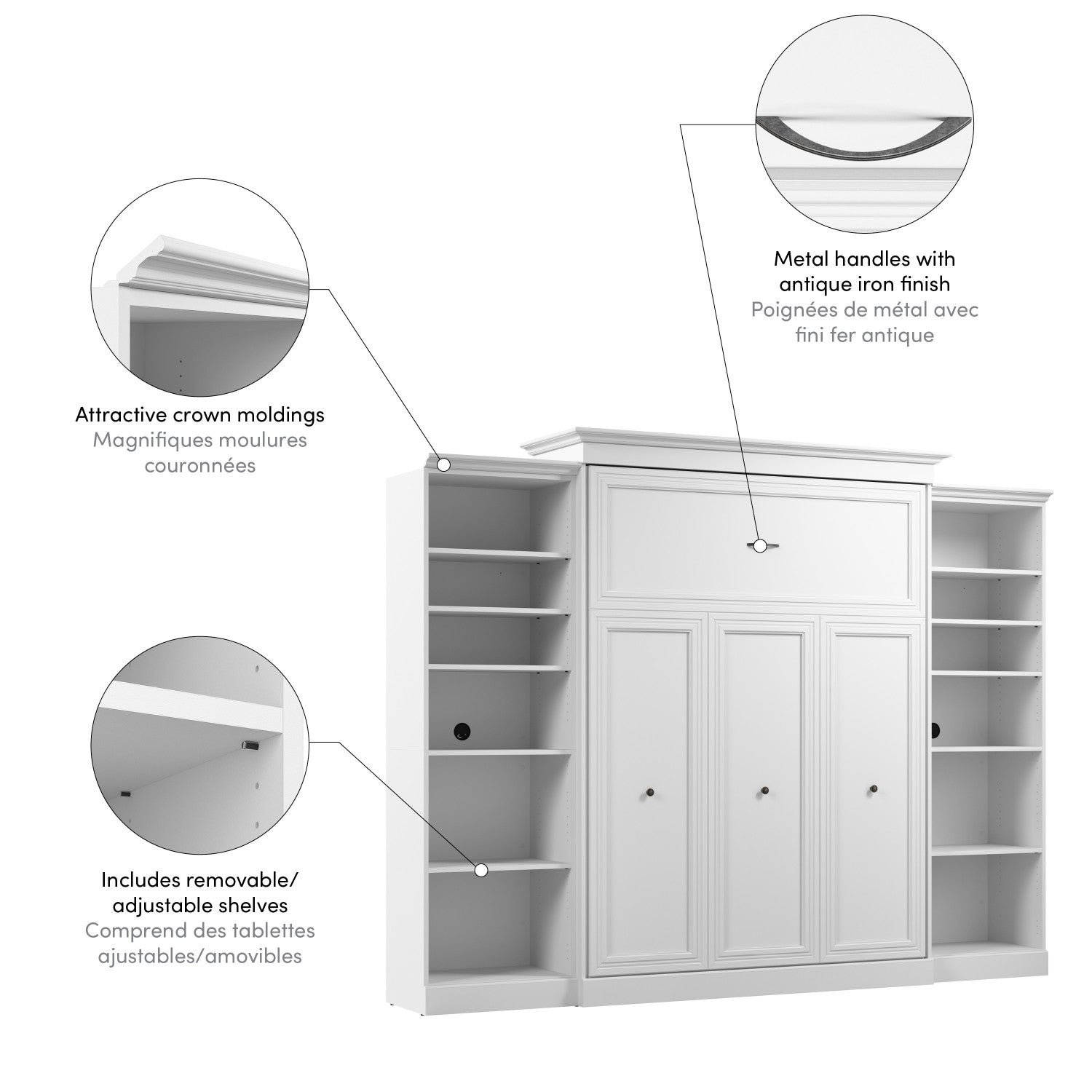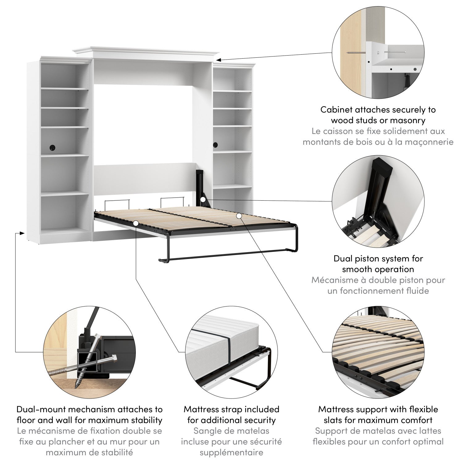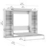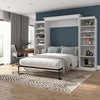 The Bestar Versatile Queen Murphy Bed and 2 Closet Organizers (115W) is the ideal space saver for a multipurpose room. The mattress support uses flexible slats that follow the curves of the body and absorb pressure for maximum comfort. The Queen Murphy bed can be used every night for a good night’s sleep. The bed folds up and down smoothly within seconds. The wall bed accommodates most standard Queen mattresses (8-12 inches thick, 60-90 lb, 60 x 80 inches) and supports up to 1000 lb (including mattress). The open bed extends 92 inches from the wall. The cabinet must be anchored to a wall with a minimum ceiling height of 93. 8 inches. Allow a clearance of 30-36 inches around the open bed. Both Closet Organizers come with 2 fixed and 4 adjustable shelves to hold your belongings. The dual-mount wall bed mechanism attaches to the floor and wall for ease of assembly and maximum stability and durability. To avoid risk of injury, the Murphy bed must be installed to wall and floor structure by a professional or qualified person. Two people are required for assembly. Installation requires attachment to wood studs or masonry, removal of the baseboard, and drilling into the floor (if disassembly is required, holes may be covered with baseboards 0. 5 inches or thicker). All necessary hardware is included. Do not use this product for children or pets under 50 pounds (22. 7 kg). Backed by the Bestar 10 Year Manufacturer’s Warranty. North American made with globally sourced materials.