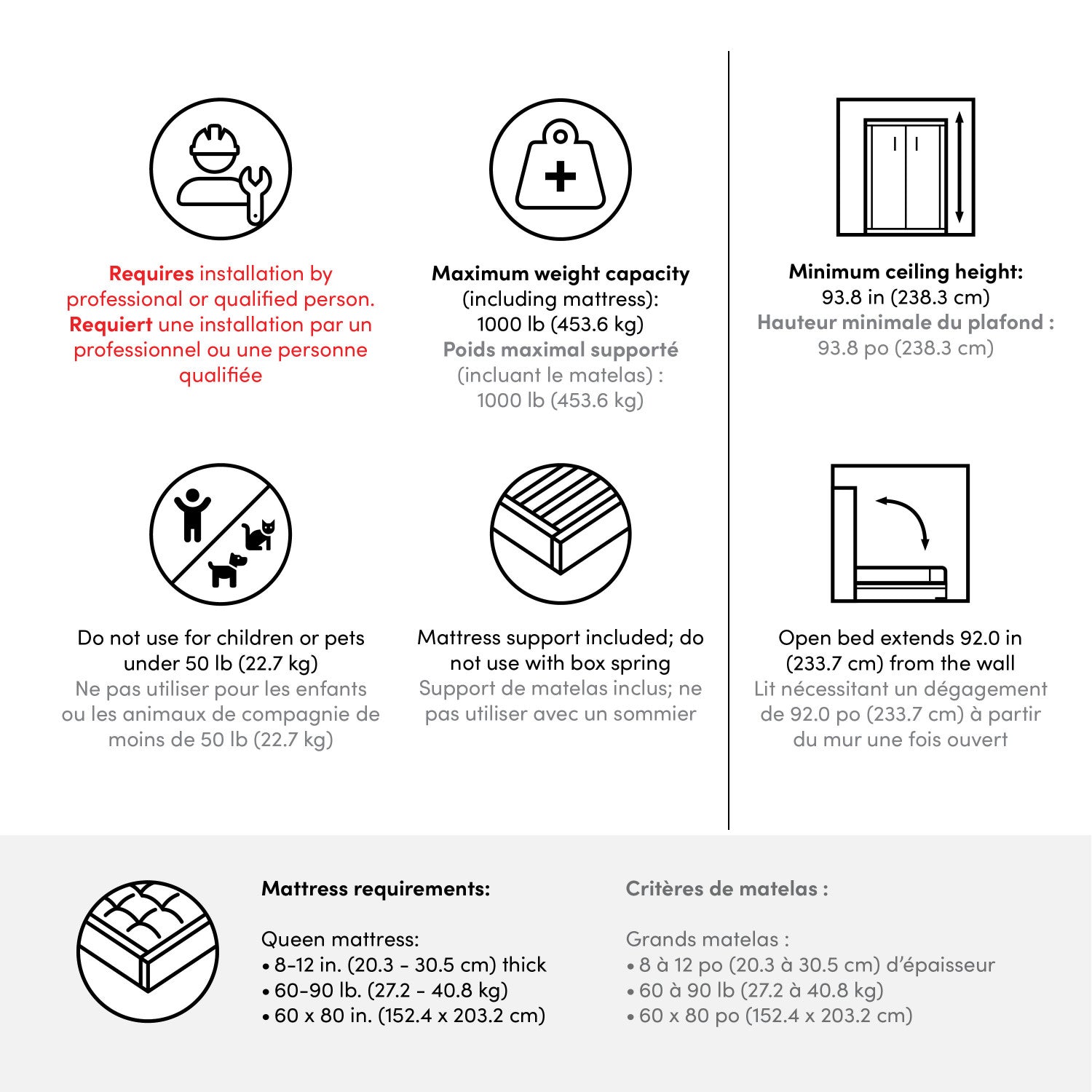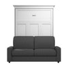 The Bestar Versatile Queen Murphy Bed with Sofa (78W) is perfect for creating a multipurpose guest room. It offers both a comfortable place to sit and to sleep. Antique Iron hardware and attractive crown moldings complement the elegant finish of your choice. Make the most out of your space with this practical Queen Murphy bed. Sit comfortably during the day and simply remove the cushions and fold out the wall bed to sleep at night. The mattress support uses flexible slats that follow the curves of the body and absorb pressure for maximum comfort. The bed accommodates most standard Queen mattresses. The cabinet must be anchored to a wall with a minimum ceiling height of 93. 8 inches. The open bed extends 92 inches from the wall. The dual-mount wall bed mechanism attaches to the floor and wall for ease of assembly and maximum stability and durability. To avoid risk of injury, the bed must be installed to wall and floor structure by a professional or qualified person. Two people are required for assembly. Installation requires attachment to wood studs or masonry, removal of the baseboard, and drilling into the floor (if disassembly is required, holes may be covered with baseboards 0. 5 inches or thicker). All necessary hardware is included. Do not use this product for children or pets under 50 pounds (22. 7 kg). This Queen Murphy bed is backed by the Bestar 10 Year Manufacturer’s Warranty, the sofa is warranted 1 year. North American made with globally sourced materials.