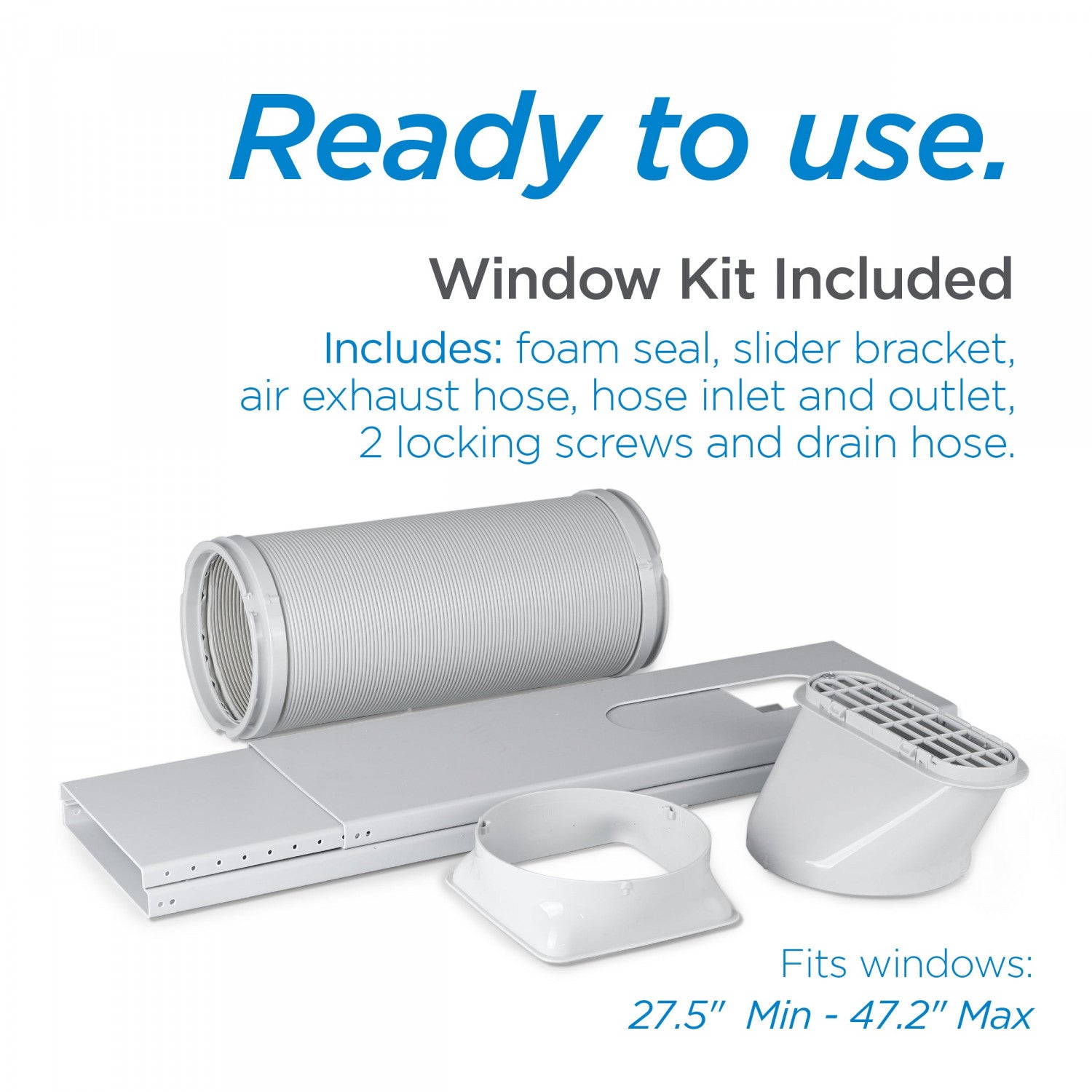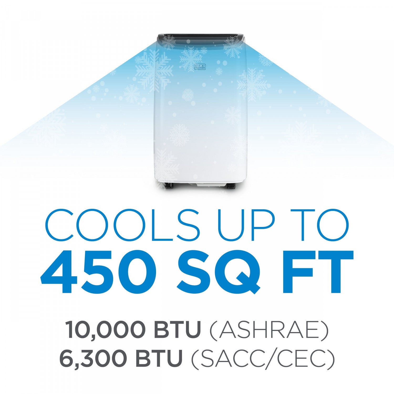 This Black+Decker 10,000 BTU (6,300 BTU sacc) portable air conditioner is your best friend during the summer months, supplying cool, free-flowing, and comfortable air 24/7 up to 450 square feet. When it comes to ac units for rooms, our portable cooler (15. 3" W x 14" D x 24. 8" H) has 3 functionalities all in one: fan, dehumidifier, and cool. Our portable air conditioners for rooms feature an easy-to-use electronic control panel and full function remote control for easy operation. Follow me feature turns your remote control into a mobile thermostat to allow for precise temperature control. It's like having your thermostat in the palm of your hand. Control temperature, fan speed and all other functions while maintaining perfect temperature control where you are and where you need it most. With a 24-hour timer that can be set on or off, slide-out washable filter, and auto water evaporation, the benefits of this room air conditioner speak for themselves. Included is a top mounted control panel with led display and an easy-to-install window kit so you can place your indoor air conditioner and room cooler air conditioner anywhere. With four casters on the bottom and two side handles, easily slide your air conditioner into any room of the house. Our portable ac unit and portable air conditioner 10,000 BTU comes with a power cord and plug storage for optimal convenience and uses r32 refrigerant for no ozone depletion. Truly, one of the best room air conditioners! The large front vented airflow outlet with 2-way adjustable louvers ensures superior functionality and total room cooler satisfaction.
