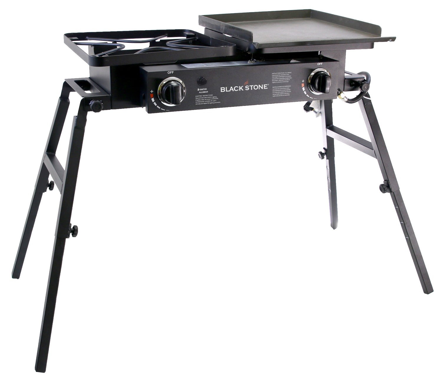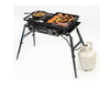 The Tailgater Combo provides three cooking methods in one. You have your tradition Grill Box for great burgers, hot dogs or to brown your brats. In addition to that, you have your griddle to sauté veggies or cook breakfast foods. Both tops remove to give you access to the burners, great for boiling shrimp or Dutch oven cooking. The legs adjust for uneven terrain and all folds up nicely for tailgating or camping.