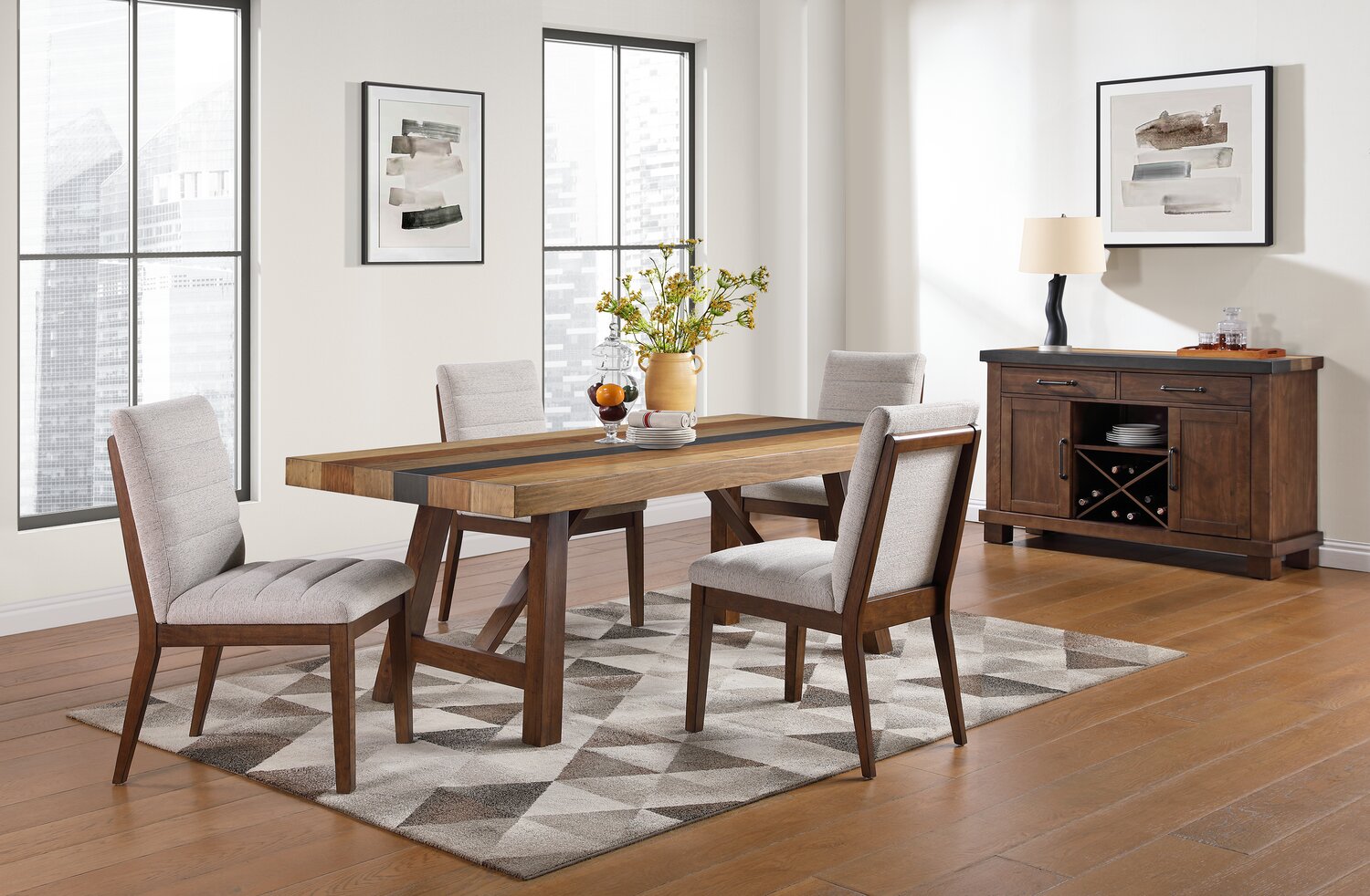 | Sold Separately | Matching Boden upholstered dining chairs with nailhead trim and dining table. |