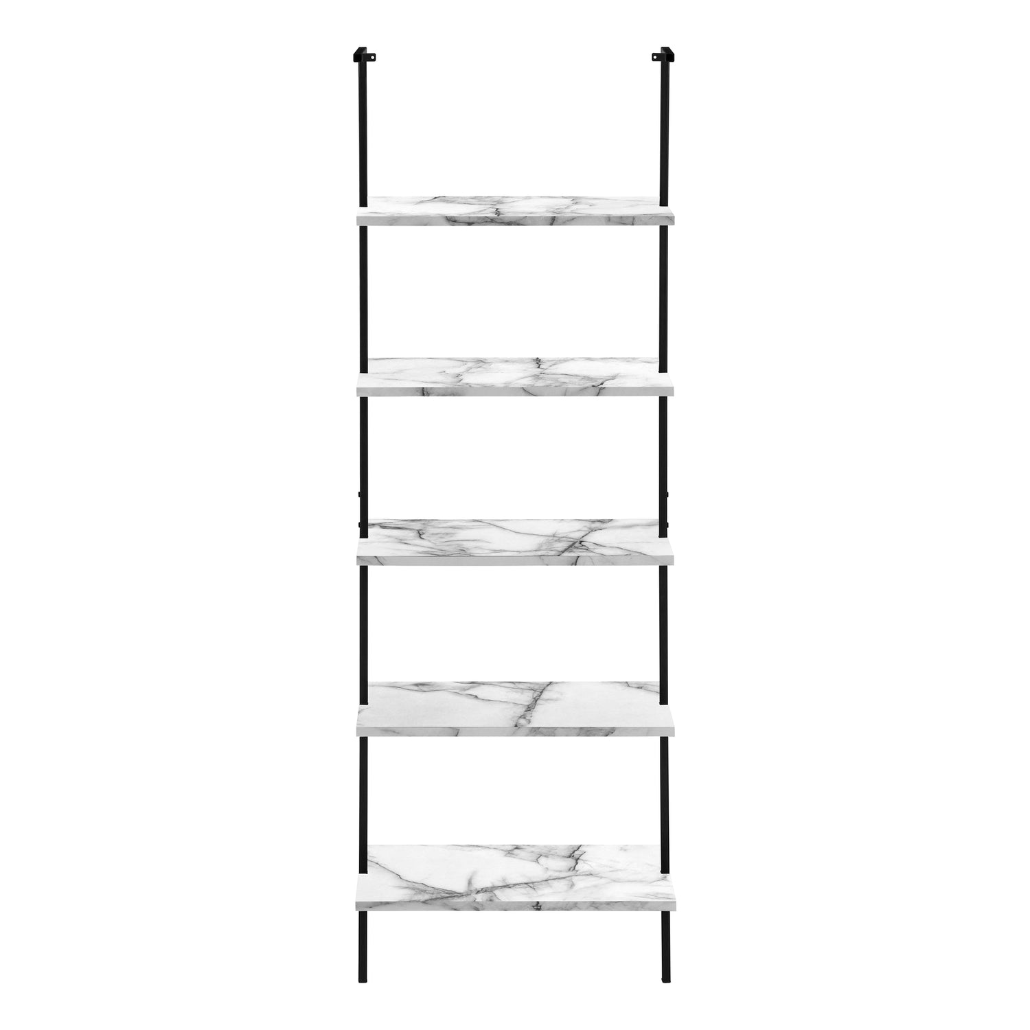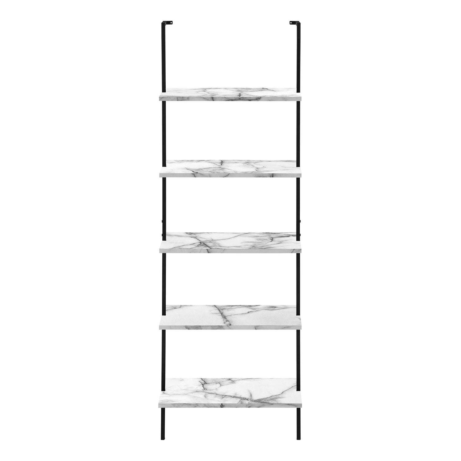 This charming and minimalist ladder bookcase is a great way to bring a modern luxury style to your decor. It is crafted with an open black metal frame for a glam look, and mounts to the wall to keep it in place. Five tier ample shelving made from engineered wood in a white marble-look finish and provide the perfect place for books, plants, bar essentials, or anything else you want to display. Mount this tall and narrow space-saving bookshelf to the wall in your home office, living room, or bedroom.