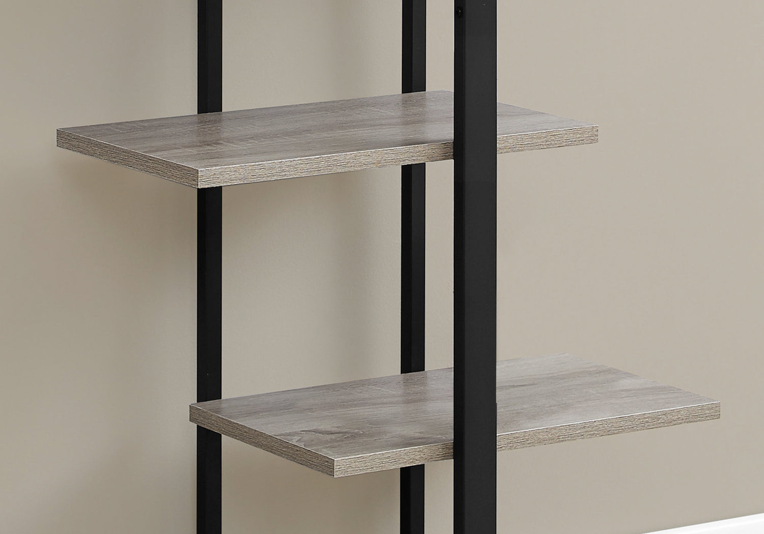 Let this etagere accent bookshelf have its moment to shine in your living room, entrance, bedroom or office. Ideal for the display of any decorative items of your choosing or your household items, this sturdy unit boasts 5 taupe display shelves finished on all sides in a unique asymmetrical zig-zag design. Supported by a robust black metal base, this bookcase will be a welcoming addition in your home. Pair it easy with many matching items.