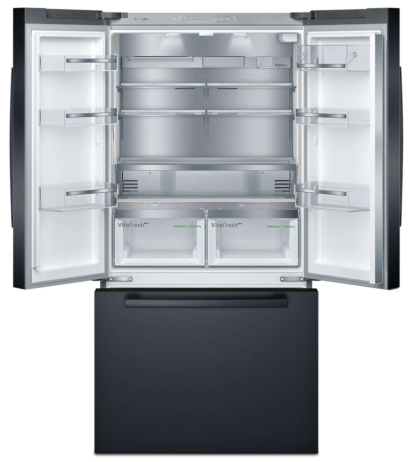 Fulfill all your cold storage needs with this French-door refrigerator by Bosch. This smart fridge comes equipped with Wi-Fi – all you need to do is download Bosch’s Home Connect™ app to control and monitor your fridge right from your smart device. Store your fresh produce, meats and cheeses in the VitaFreshPro™ drawer that automatically maintains optimal temperature and humidity to keep food fresher for longer. This counter-depth refrigerator sits flush with the countertop, features hidden hinges, and discreetly tucked away feet, all to give you a true built-in look and feel.