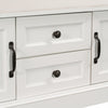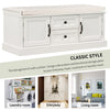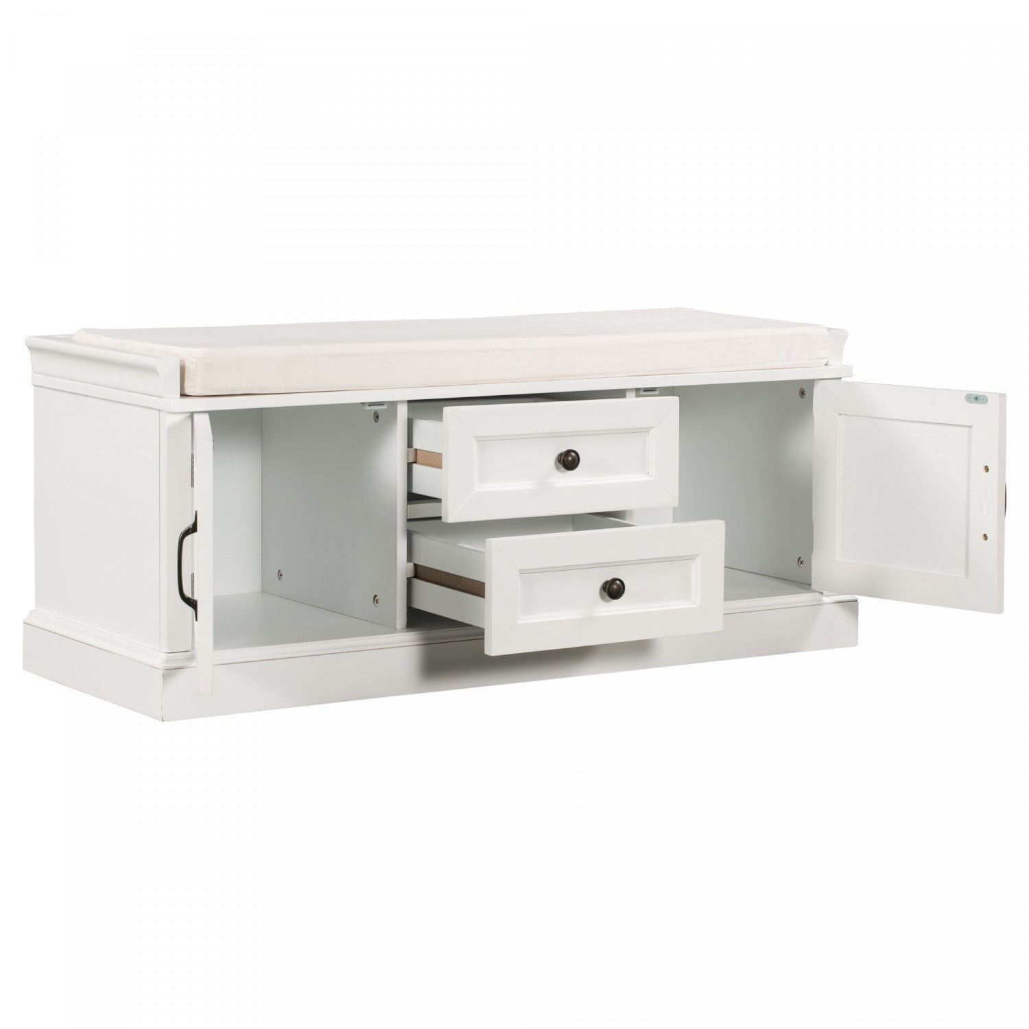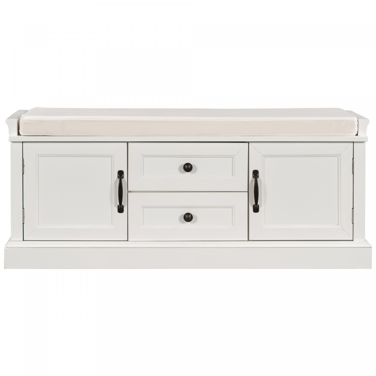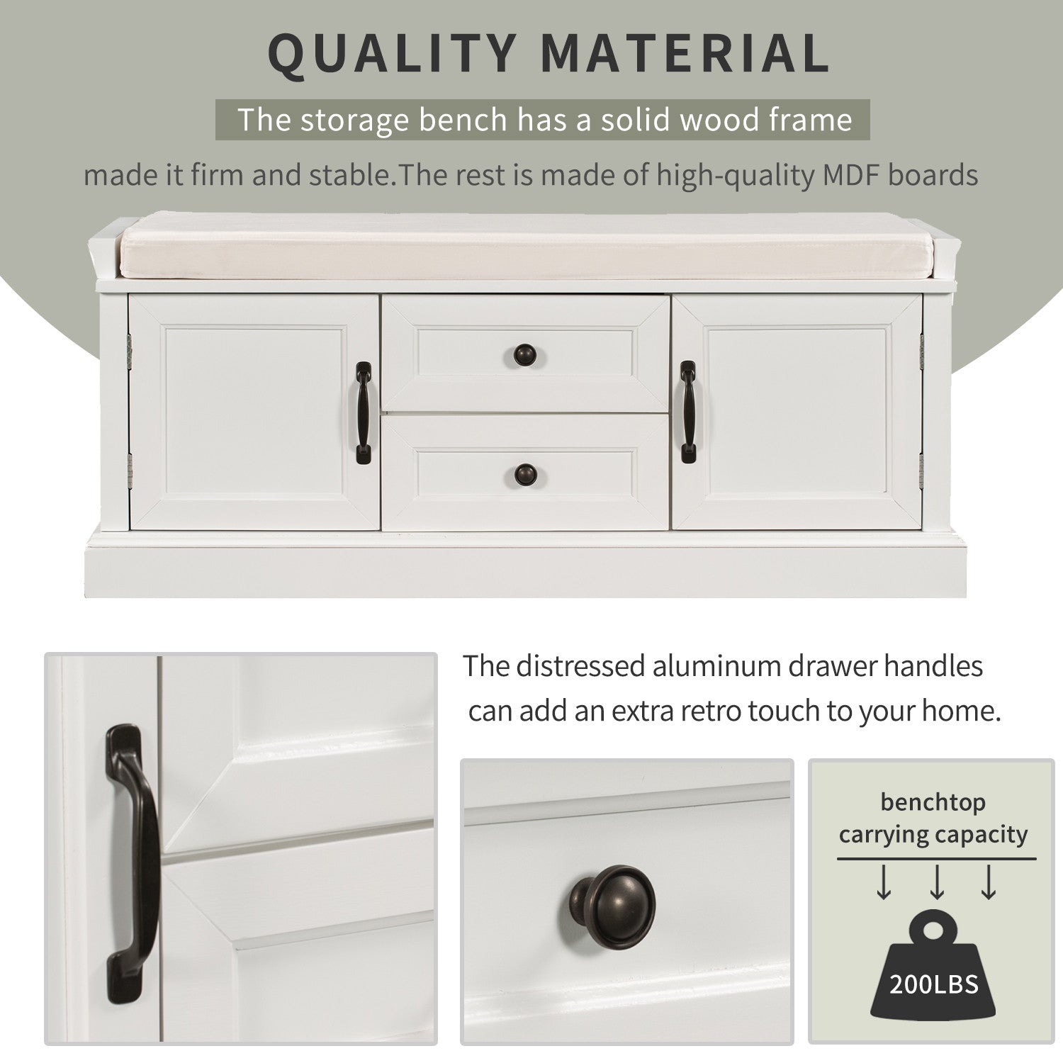 Keep your entryway organized with the storage bench, combining classic design with everyday functionality. This bench features four doors with adjustable shelves, perfect for storing shoes, books, or other essentials. Crafted from solid wood and mdf, it offers long-lasting durability. A removable 2. 2-inch velvet cushion provides comfort while sitting. Retro-style aluminum handles add a vintage touch, making this bench a stylish addition to your hallway, mudroom, or living room.