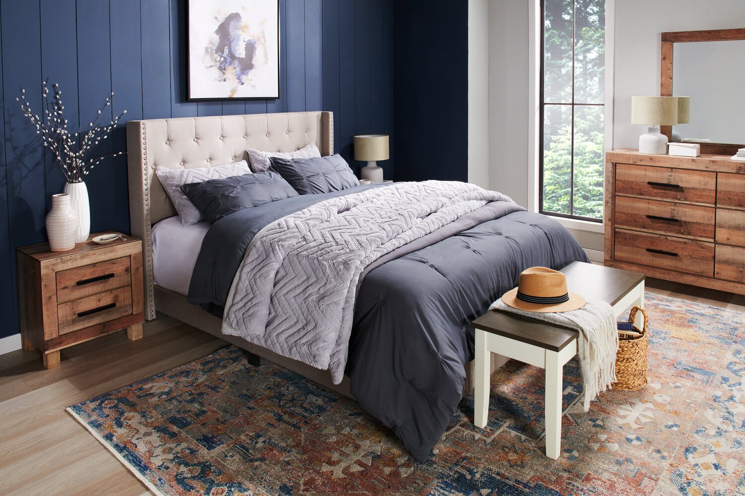 | Hardware | Chrome finishing on the button-tufted headboard adds a sparkling element to this bed. |