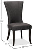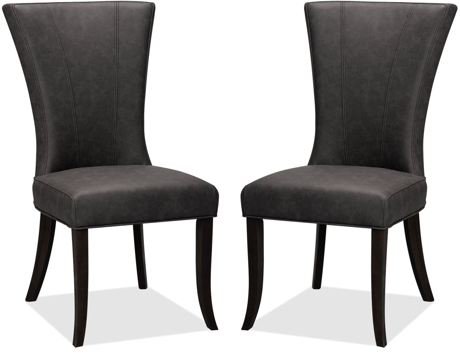 Discover the perfect utility piece for your home with this pair of Bree dining chairs. Whether you need comfortable chairs for a formal dinner or something casual for poker night, you'll find what you need in the rugged good looks of these cozy seats. The leather-look fabric provides a classic style that suits many decor themes, offering comfort and texture in one handsome package. From top to bottom, the V-shaped motif extends through the curving of the backrests and accent stitching down to the tapered wooden legs.