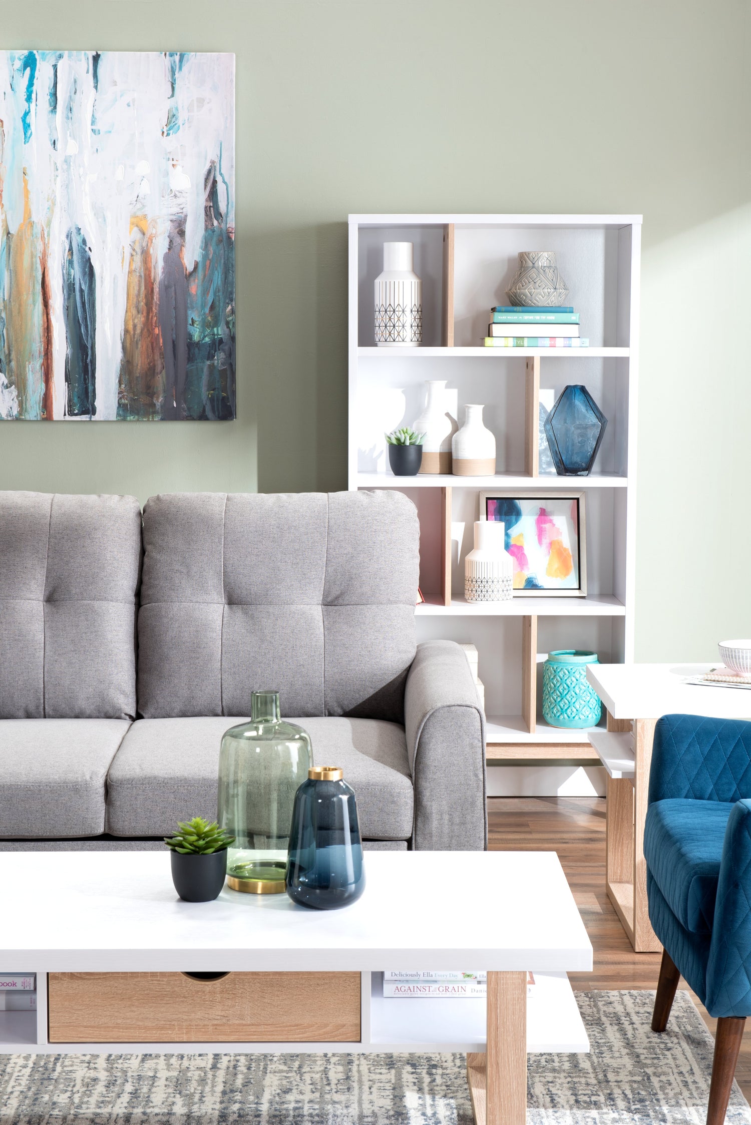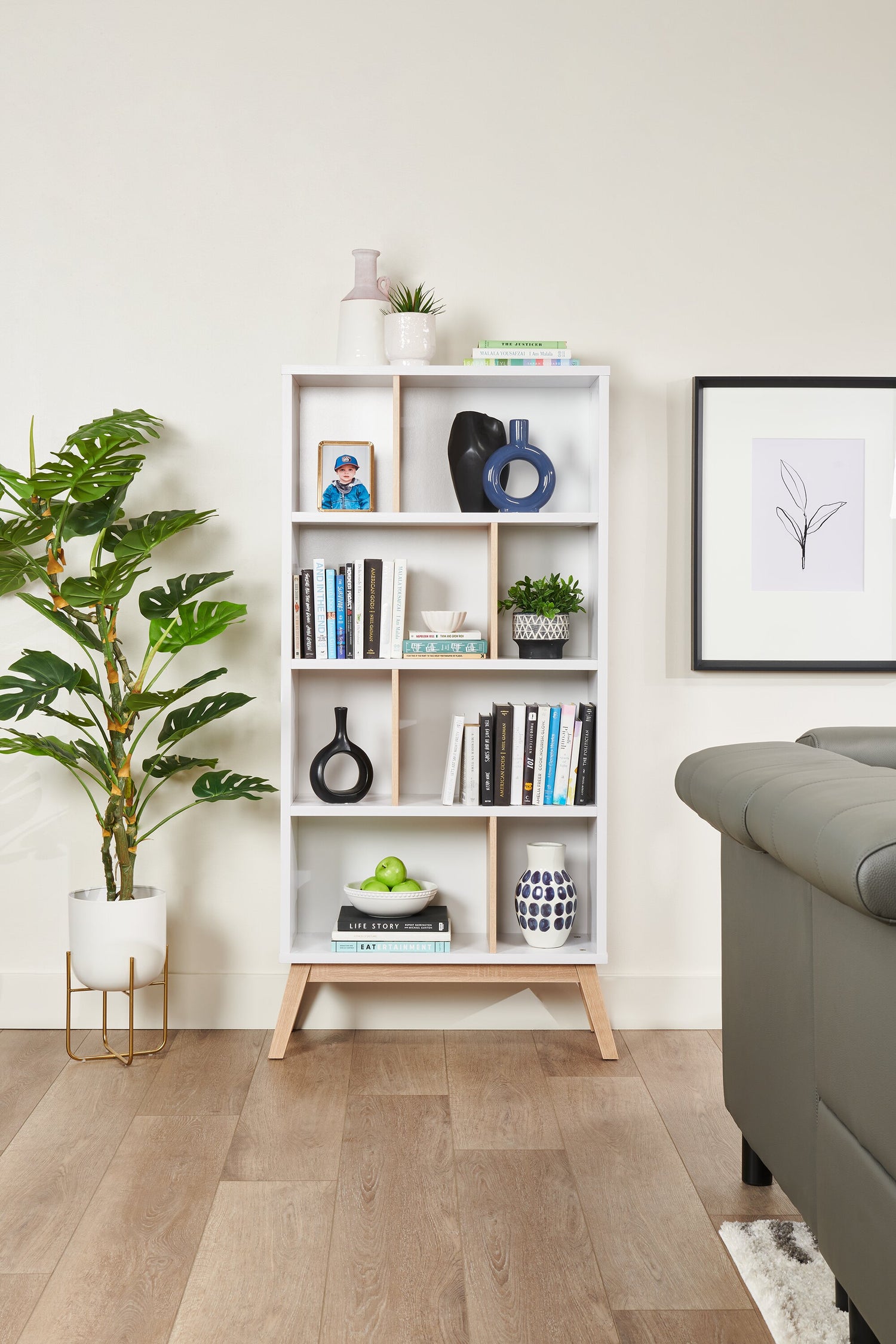 Relive the best of retro, mid-century decor with this beautiful Bremen bookcase. Featuring four tall shelves with staggered dividers, this piece lets you show off your best home accessories in many wondrous ways. The mix of light, two-tone colours keeps this piece out of plain territory, so the clean and modern look you've been cultivating won't be disturbed. And finally, four flared, solid wood legs elevate this piece to stylish new heights.