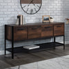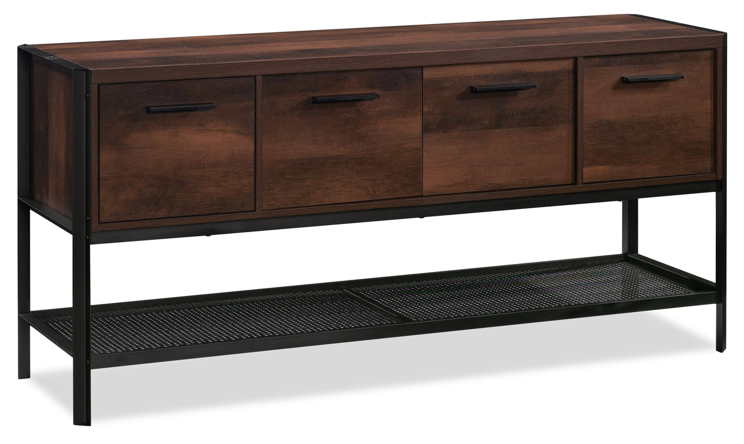 This Briarbrook credenza provides exemplary storage and style where you need it most. Whether at home or at work, this piece can house a wide array of items like office essentials, books or your favourite accent pieces. Hidden storage behind the centre doors offers a discrete spot to tuck away clutter, while two file drawers hold letter-size hanging files—keeping important papers close and easy to find. With a durable, powder-coated metal frame and finished in a dark brown tone, the Briarbrook is an example of industrial excellence.