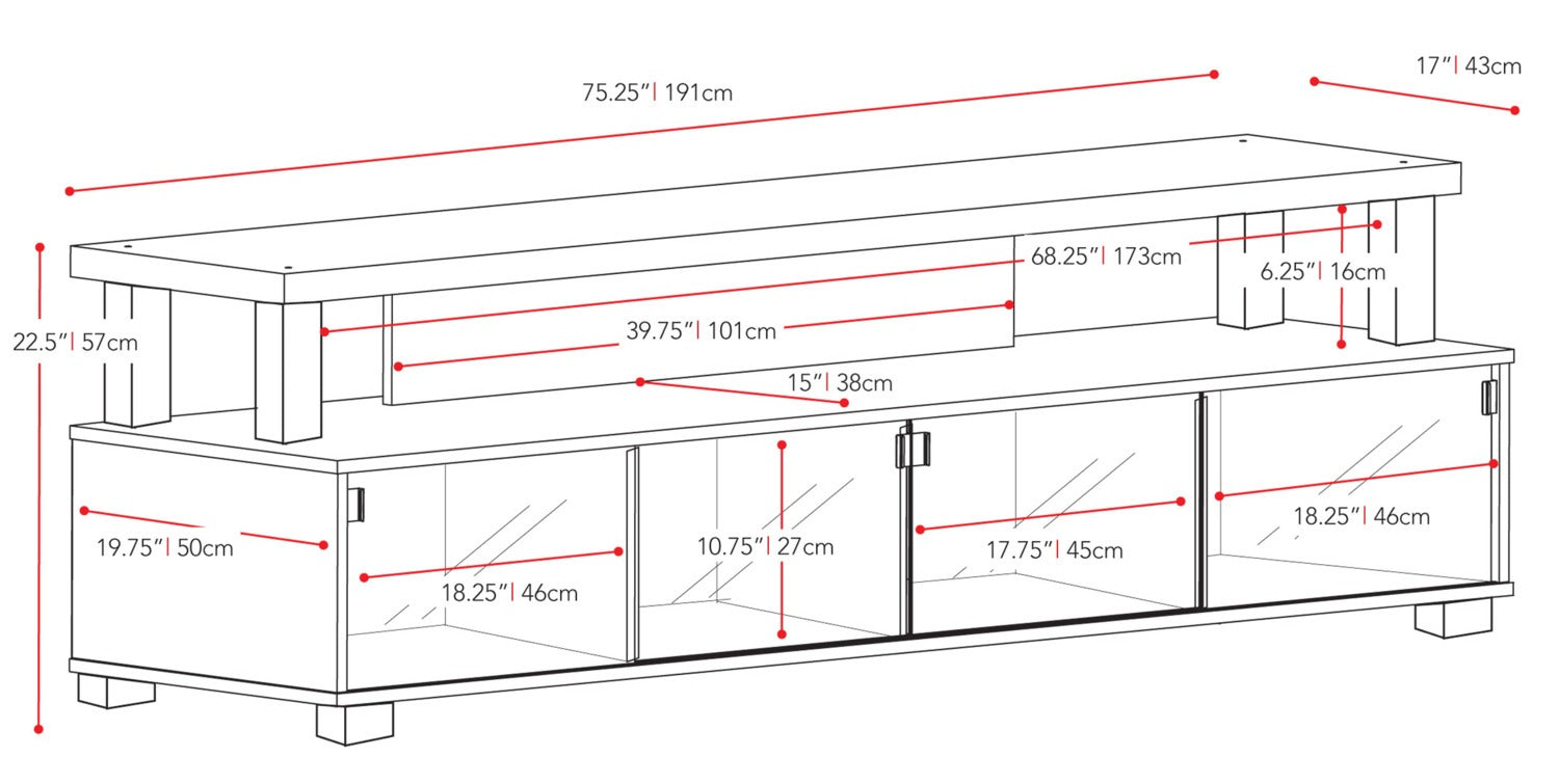 Width: 75.25" (191.1 cm) Height: 22.50" (57.2 cm) Depth: 17.00" (43.2 cm)