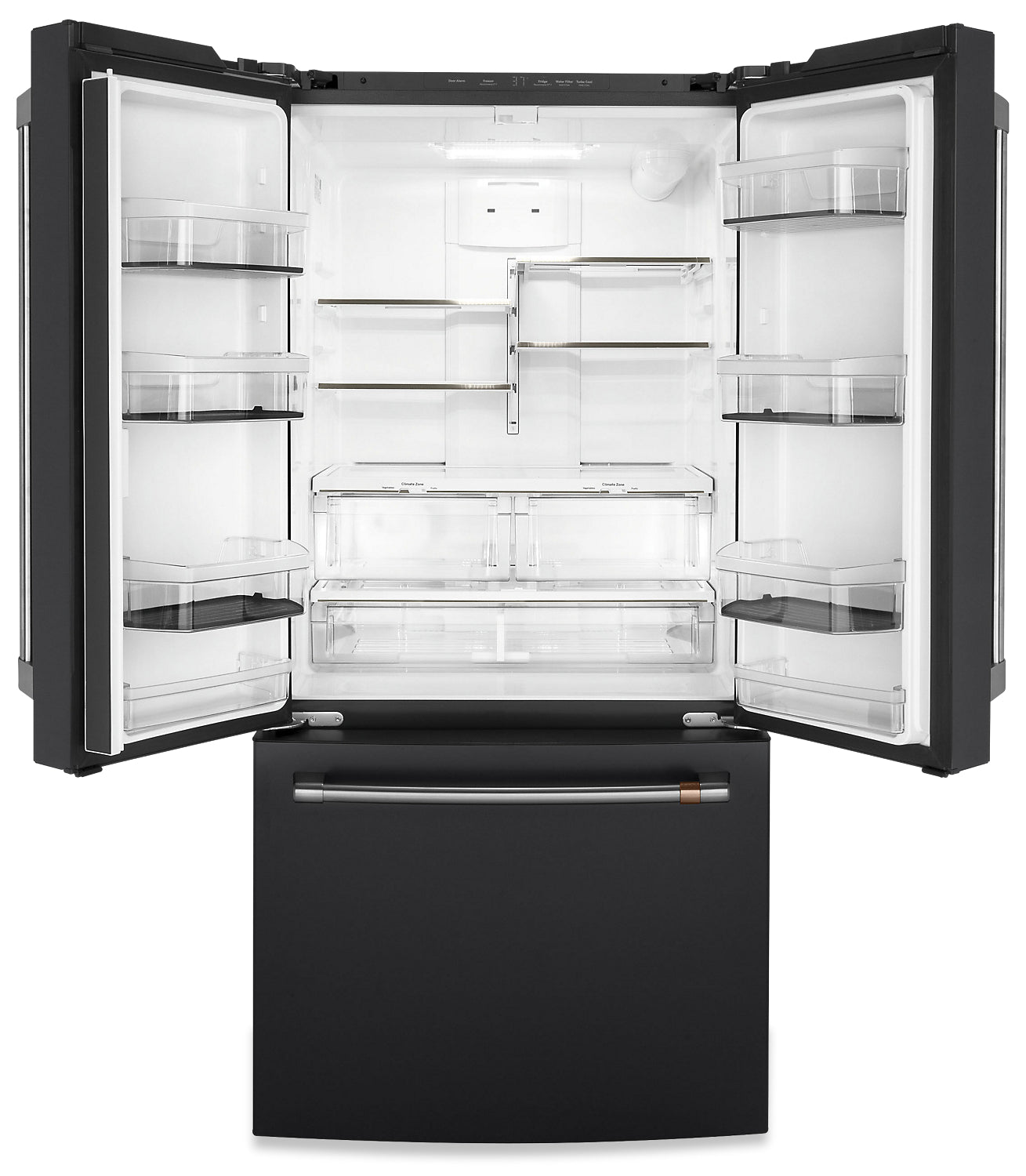 Enjoy the exterior aesthetics and interior amenities of this 18.6-cubic-foot French-door refrigerator by Café. Contoured crown doors and hidden door hinges create a lush, counter-depth design that transforms your kitchen to a contemporary haven. Plus, the convenient filtered water dispenser is located internally, keeping the outside of the fridge sleek and clean. This high-efficiency fridge also features two humidity-controlled crisper drawers to maintain an ideal temperature for fresh fruits and vegetables.