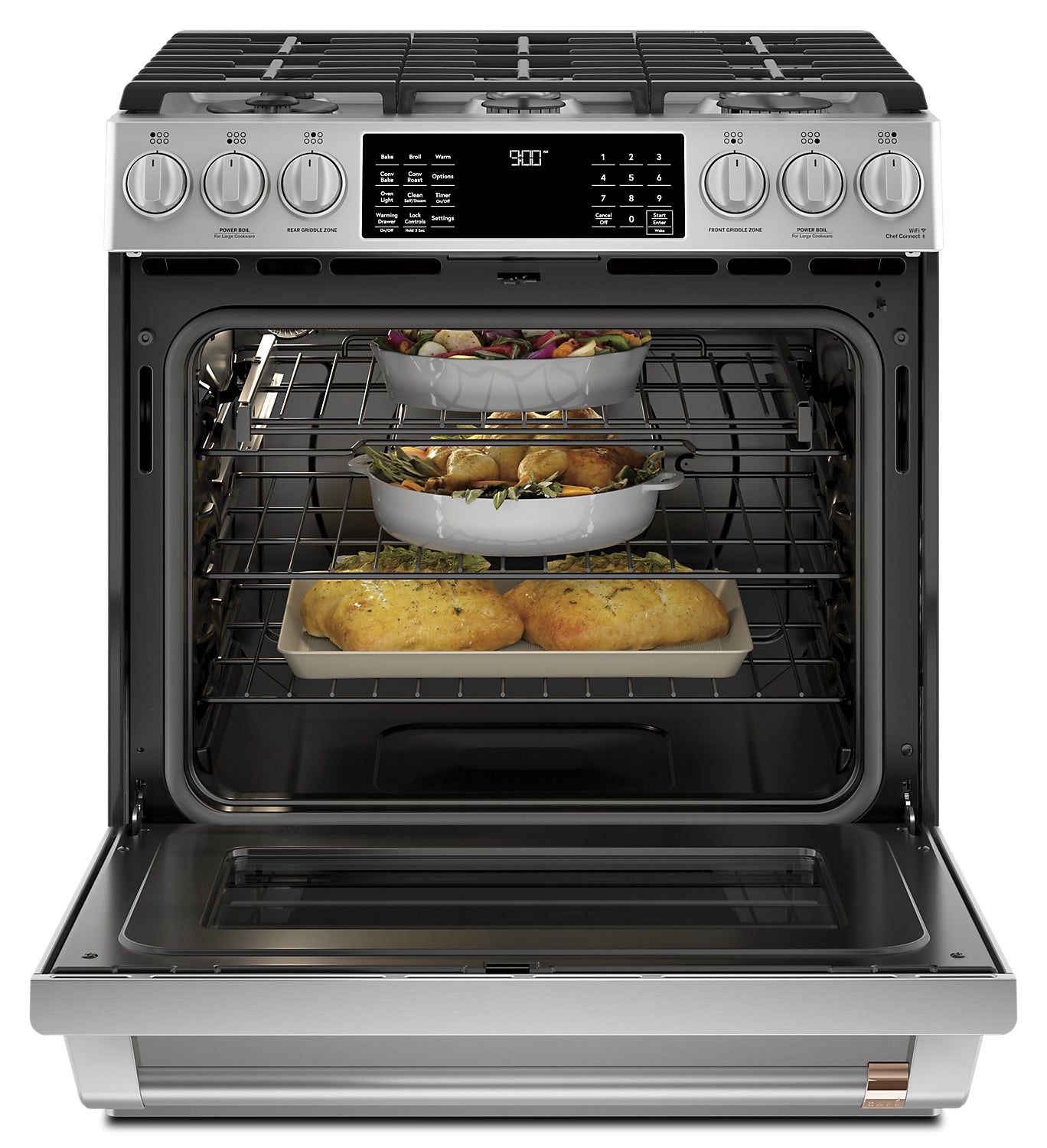 Get the best of both worlds with this dual-fuel convection range from GE Café. Enjoy precise heat control from a mighty gas-powered cooktop and even baking results in the electric oven with True European Convection with Precise Air. An aesthetically-pleasing design adds an element of opulent style, while the Wi-Fi capability makes it easier than ever to stay connected from anywhere, making this range a must-have for masterfully crafted multi-course meals.
