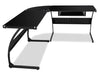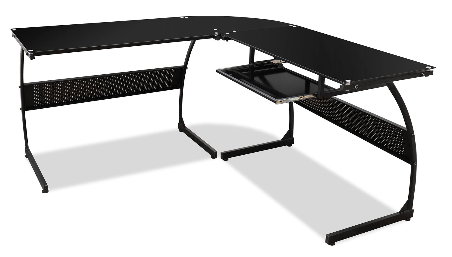 Give yourself all the space you need with this sleek and smooth Cairo desk. This wide L-shaped desk can be placed in the corner where the broad glass tabletops provide plenty of room for your computer and work materials. The black tempered glass looks elegant and is easy to clean, while the keyboard tray below the tabletop frees up even more space. Supported by a sturdy black metal frame, this desk looks elegant while keeping everything within reach.
