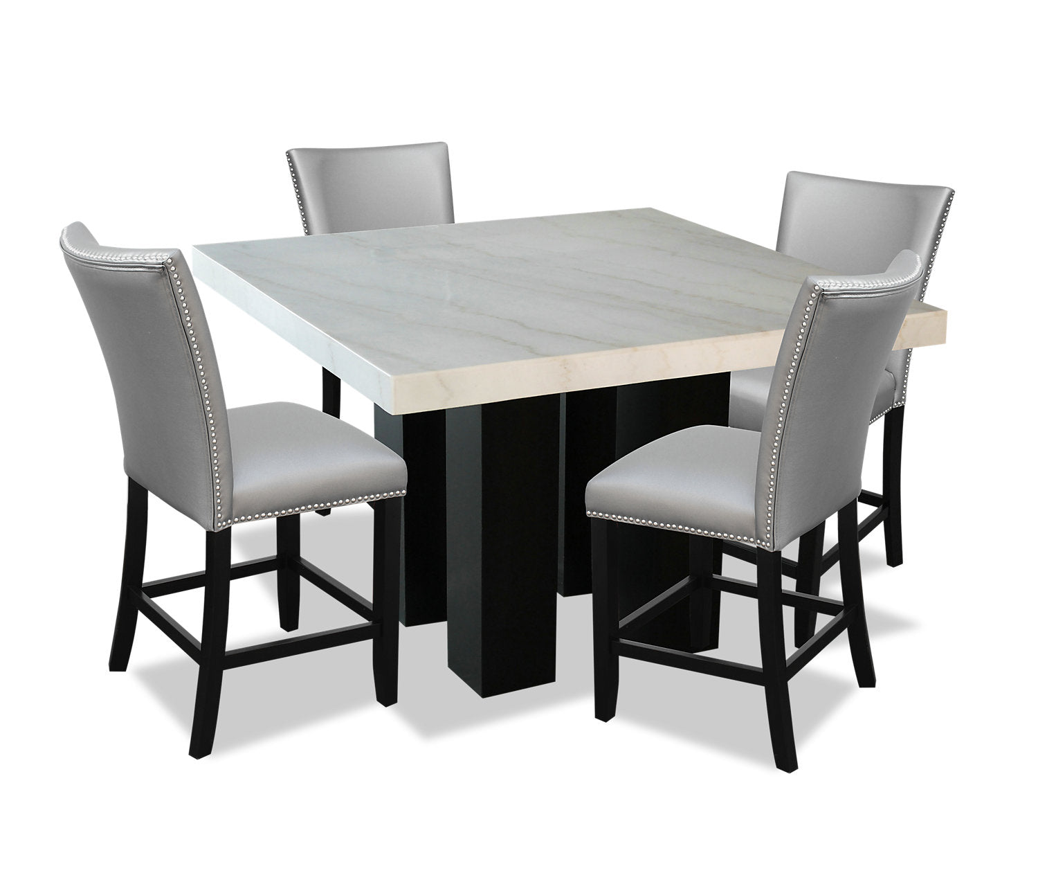 Add some contemporary elegance to your dinner tonight with this Cami five-piece counter-height grey dining room set. Pure white marble decorates the top and sides of the table, with veins of contrasting colour running through the stone for an extra pop of natural style. Smooth, grey faux leather lends a smoky touch to your dining space, while supple memory foam makes your chair seat extra comfortable. A row of glittering silver nailheads line the edges of the seat and the back to add a layer of sparkle. Add this Cami set to your dining space and let this stone-cold stunner add a dash of sophistication to your mealtime.