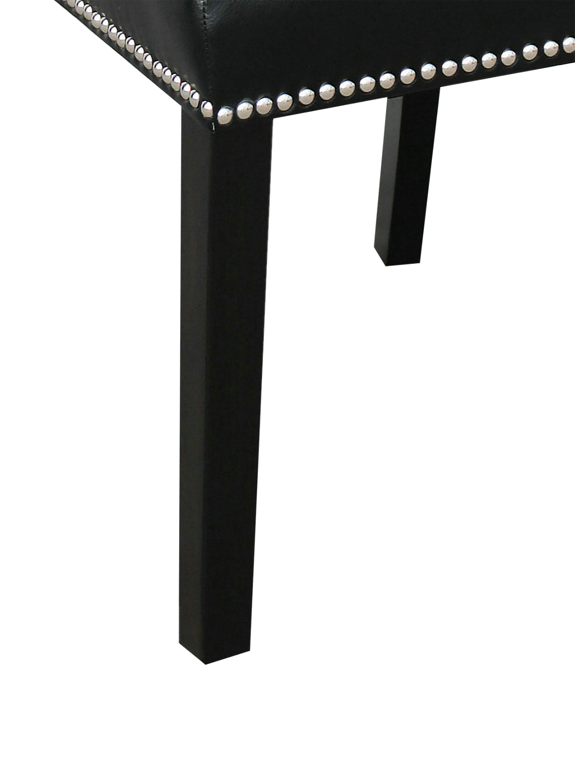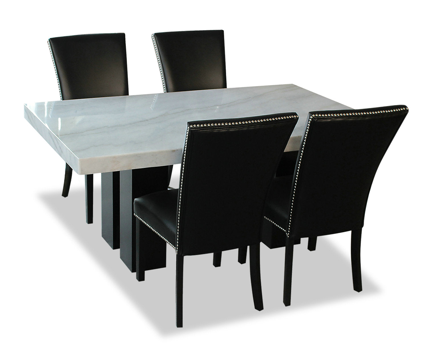 Add some contemporary elegance to your dinner tonight with this Cami five-piece black dining room set. Pure white marble decorates the top and sides of the table, with veins of contrasting colour running through the stone for an extra pop of natural style. Smooth, black faux leather lends a dark touch to your dining space, while supple memory foam makes your chair seat extra comfortable. A row of glittering silver nailheads line the edges of the seat and the back to add a layer of sparkle. Add this Cami set to your dining space and let this stone-cold stunner add a dash of sophistication to your mealtime.