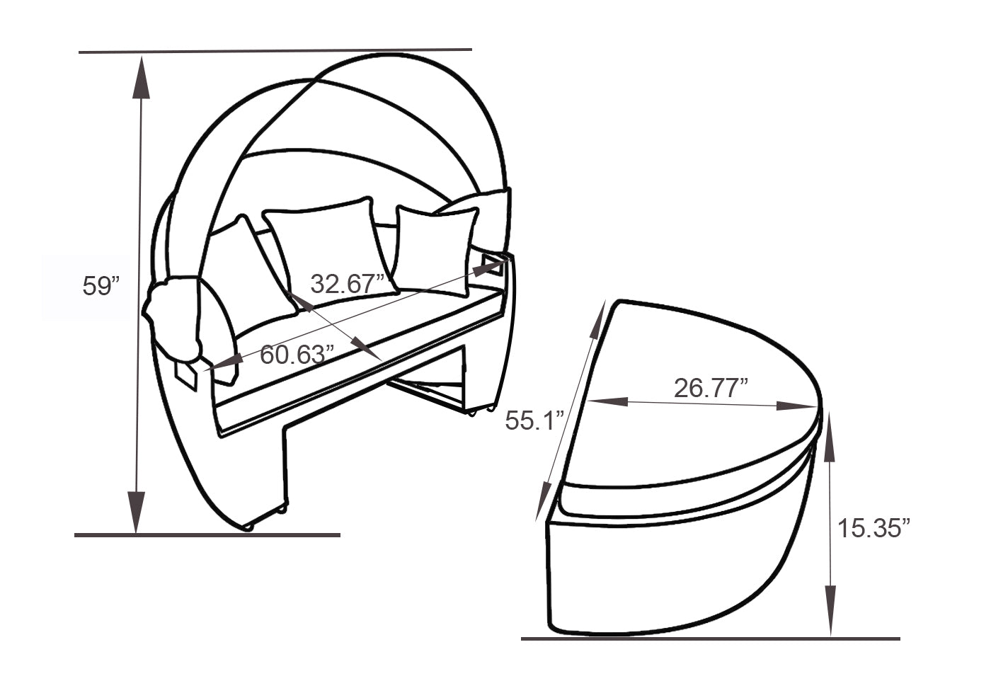 Width: 60.6" (153.9 cm) Height: 33.46" (85.0 cm) Depth: 32.67" (83.0 cm)