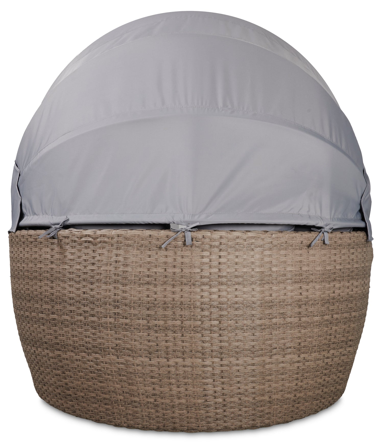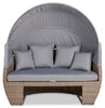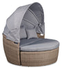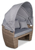 Create your own cozy outdoor retreat with the Capri patio conversation set. It features a large round seat with a canopy that allows you to relax in the sun or build a covered getaway. When hosting outdoor barbecues, you can push the seat and ottoman together for a larger lounging space. Alternatively, you can use the ottoman to place trays of snacks for entertaining. Plus, the set comes with four pillows for optimal comfort. The hand-woven resin wicker frame lends perfect outdoorsy style and is mounted on powder-coated steel for sturdy support. Spend the day in absolute bliss with the Capri.