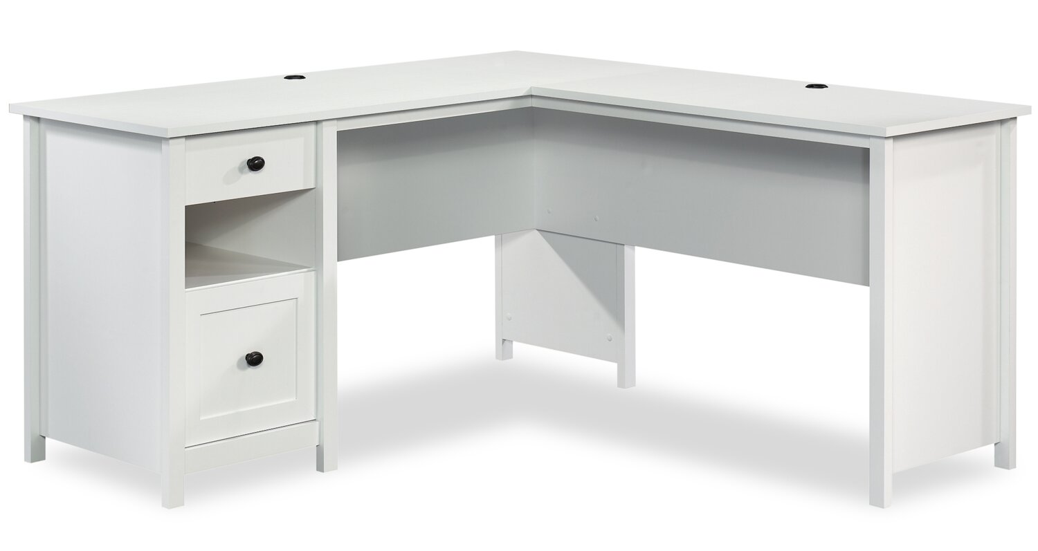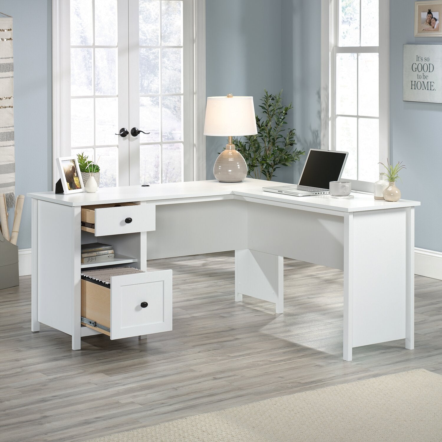 Whether you’re working, tackling your latest art project or enjoying a hobby, do so comfortably with this Cayla L-shaped desk. A spacious top surface accommodates a computer, binders and photos of your loved ones – this unit has room for it all. It includes a file drawer with full extension slides that holds letter-sized hanging files to keep your documents organized, and store your pens, stapler and notecards in a smaller drawer with metal runners and safety stops. An open shelf for additional storage allows you to display items like books and home decor pieces. Small in size, this desk is finished on all sides so it will look polished no matter how you arrange it in your office and two desktop grommets keep your workspace free of cord clutter. The Cayla adds the right amount of space and style to any office.