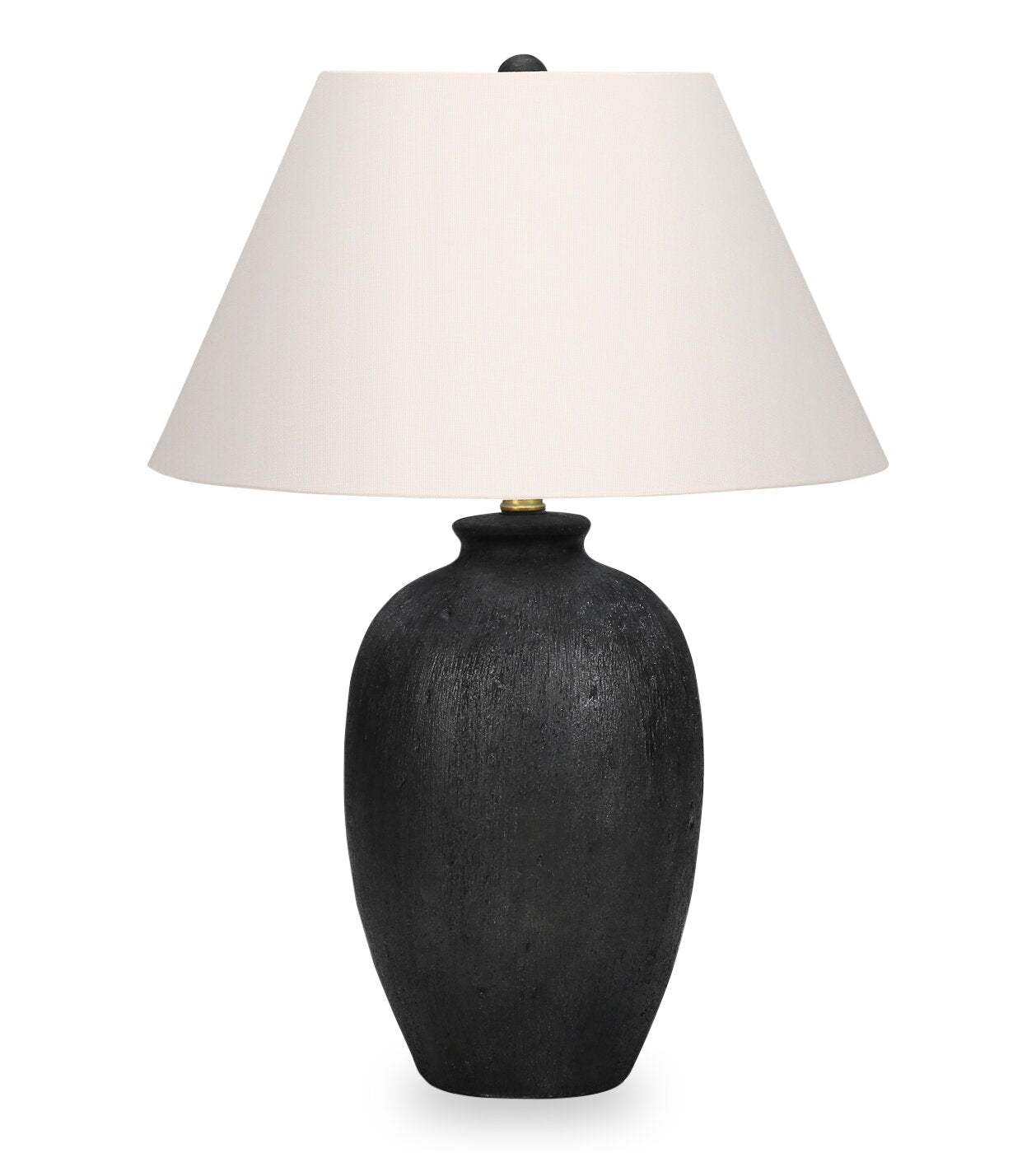 Bring some modern sophistication to any room with this stylish 24"h table lamp. A beautiful blend of a textured black ceramic vase-shaped base and ivory linen empire shade, and finished with a round black finial on top, this lamp is a great way to brighten any bedroom, living room or office. Attached with a 5ft transparent cord and an easy-to-reach rotary switch, your room's ambiance will be illuminated with a single bulb (not included) for a maximum outage of 60W/120V. This is the perfect functional accent to place on an end or side table, nightstand or bedside table. Made with quality materials, this lamp includes a 2-year limited warranty against any manufacturer's defects for a worry-free purchase.