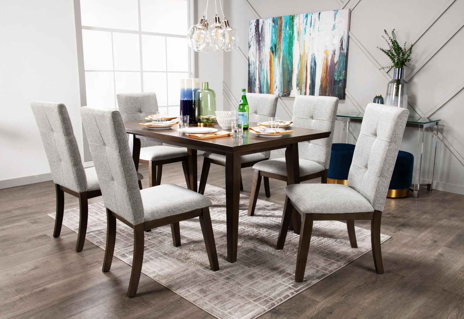 Turn an everyday meal into a lasting memory with this Chelsea grey-brown seven-piece rectangular dining package. Solid rubberwood capped with Mindi veneer provides a rich grey-brown finish that brings a touch of nature to your dining room. A broad tabletop is supported by tapered legs for a wide surface ready to hold all your favourite home-cooked dishes or takeout boxes. Soft grey polyester fabric covers a high, finely tufted chair back for a look that's both eye-catching and deliciously cozy. Settle into the Chelsea for your next big family meal and let dinnertime bliss begin.