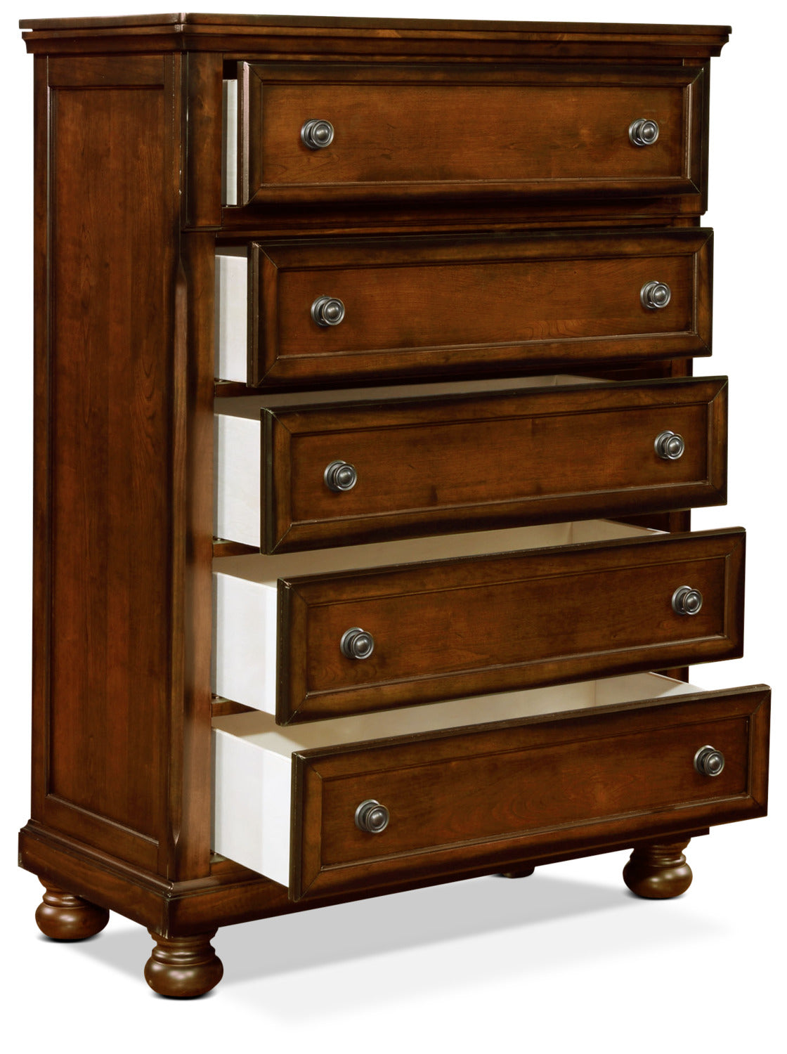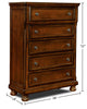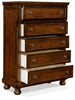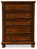 Add a traditional touch to your bedroom with this Chelsea chest. Of the five functional drawers, each slides in and out effortlessly. All drawer fronts are decorated with detailed frames and antique brass-finished hardware. The top drawer is lined with felt for extra special treatment for your personal treasures. The radiant cherry veneers look ravishing in natural light, making for a classic colour that tends to grow richer in character with each passing year. Behind the veneers, pine solids keep this piece strong yet relatively lightweight.